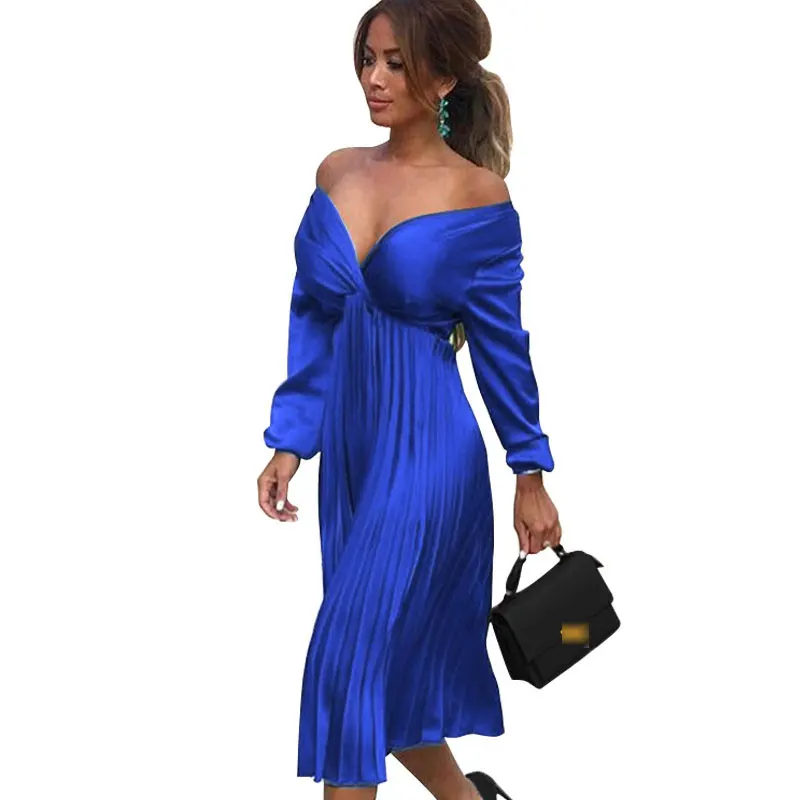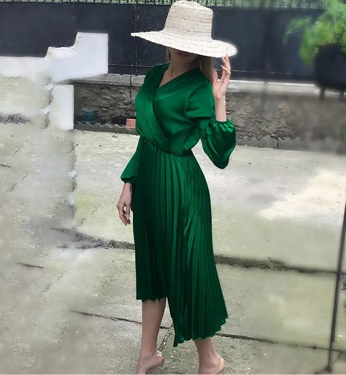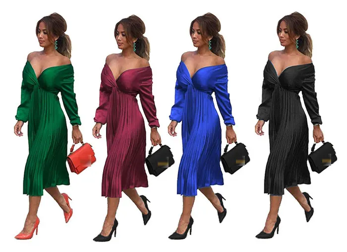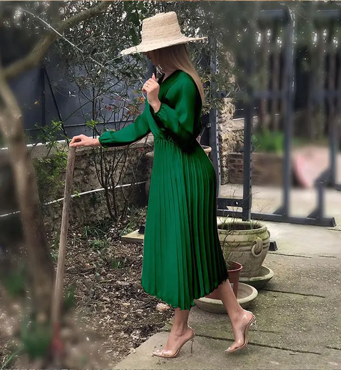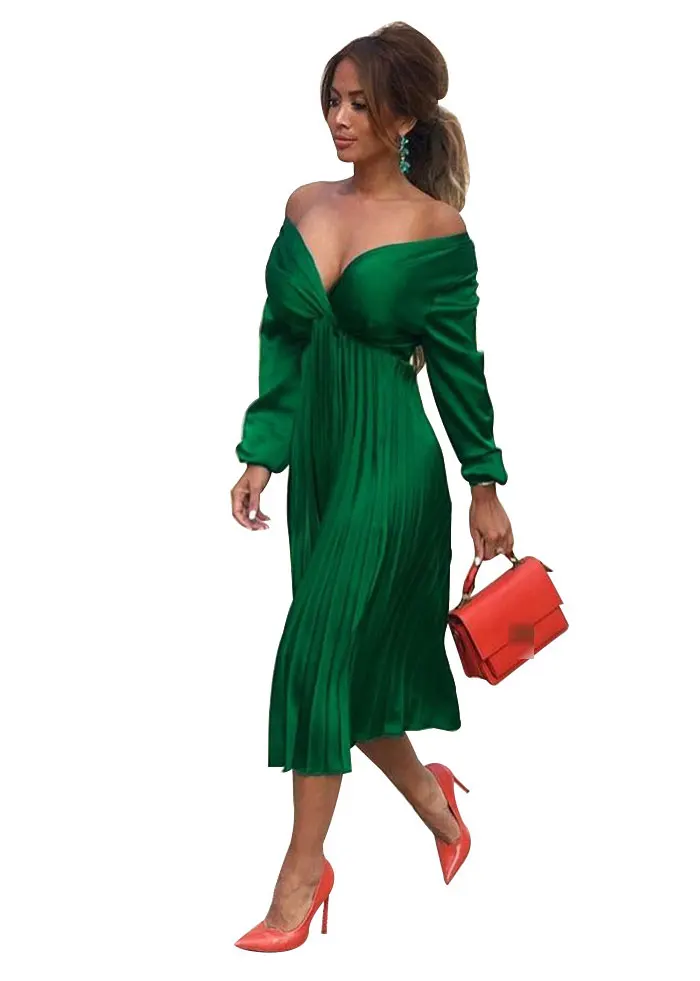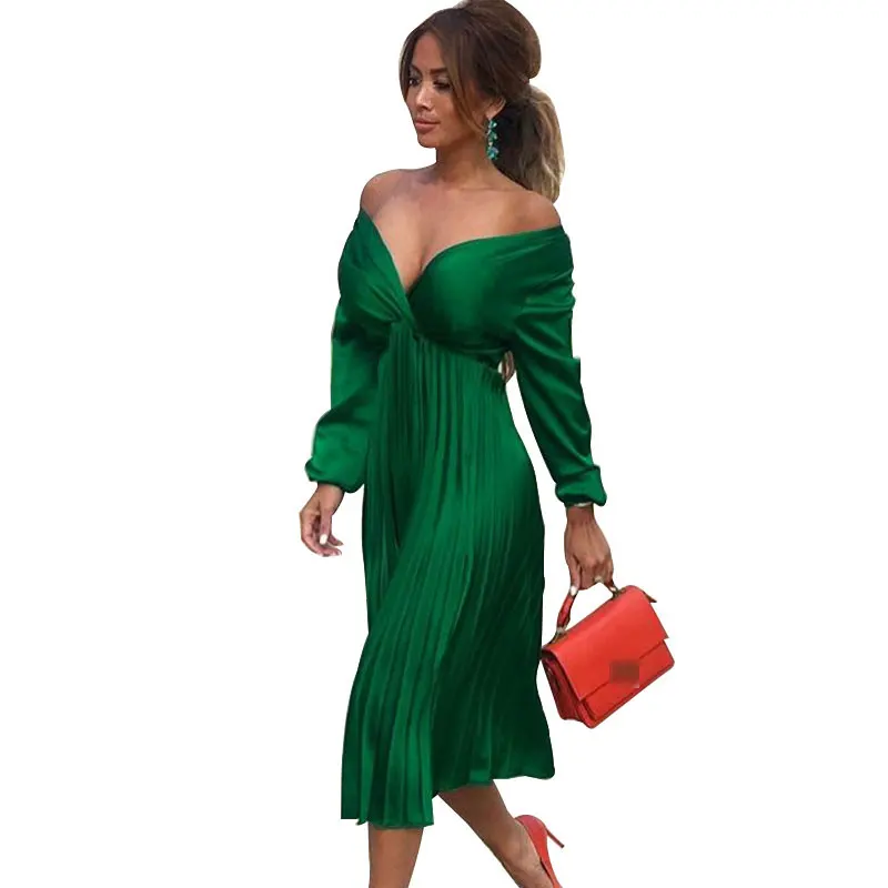 Элегантное Плиссированное атласное платье для женщин, Осень-зима 2021, женские повседневные зеленые платья с открытыми плечами и длинным рукавом, сексуальное праздвечерние чное платье
