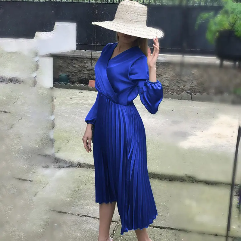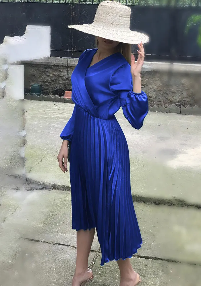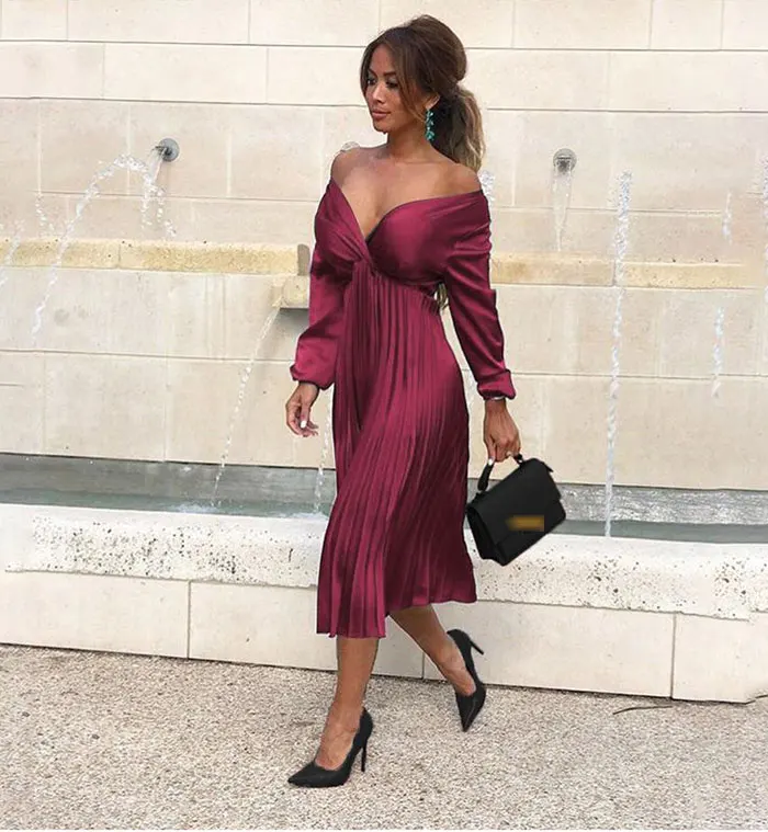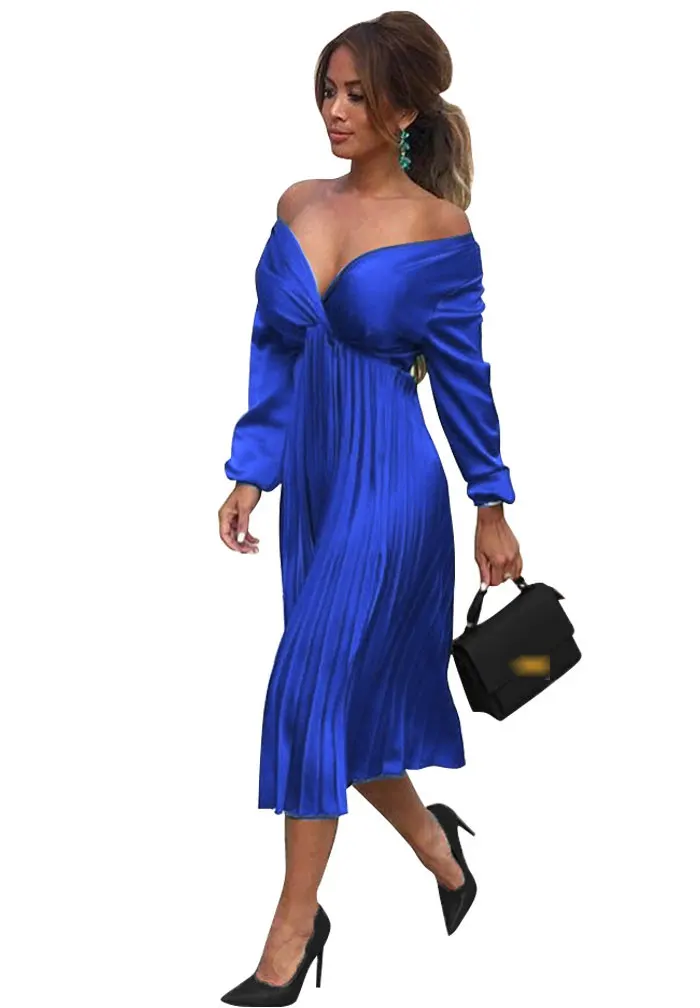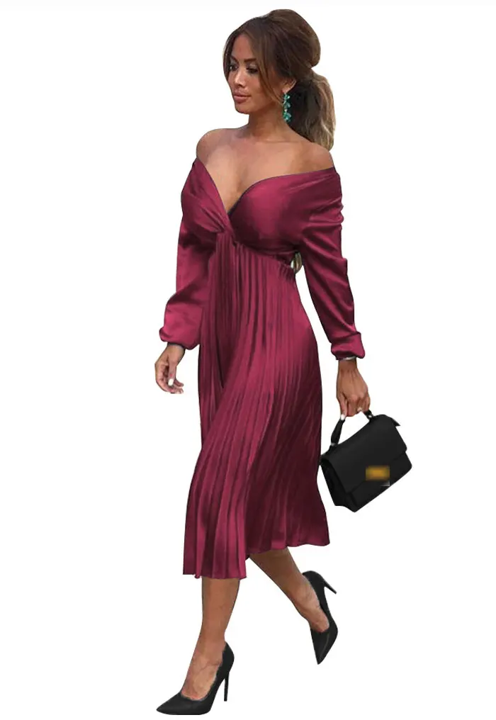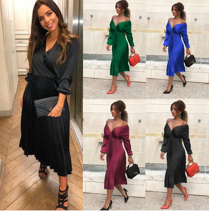 Элегантное Плиссированное атласное платье для женщин, Осень-зима 2021, женские повседневные зеленые платья с открытыми плечами и длинным рукавом, сексуальное праздвечерние чное платье