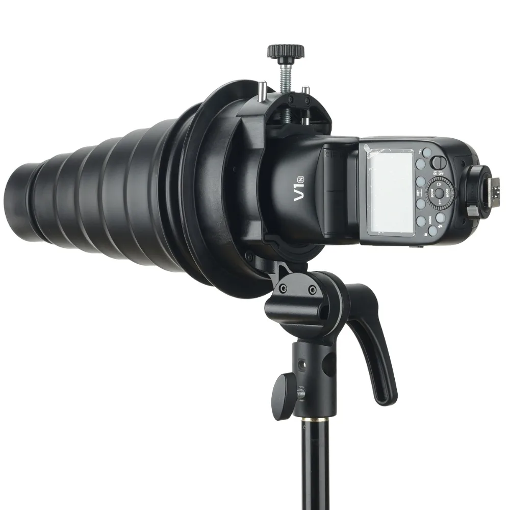Оптимизированный запатентованный продукт превосходит кронштейн Godox S-type speedlite: универсальный, меньшего размера, портативный дизайн, отсутствие сборки/разборки и простая система крепления. Быстро добавьте аксессуары для осветительных приборов Bowens, чтобы получить креативные световые эффекты.