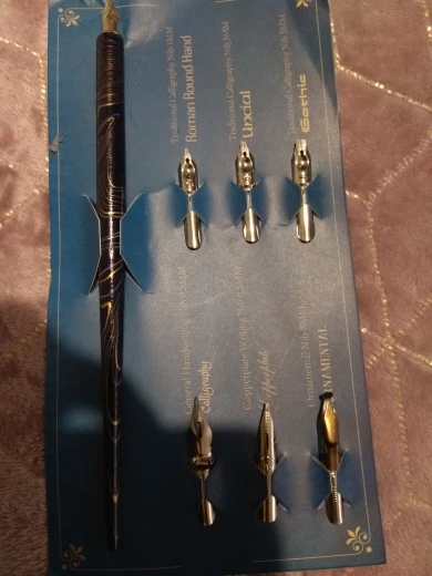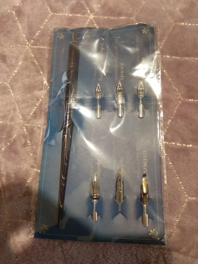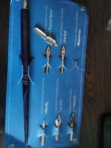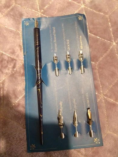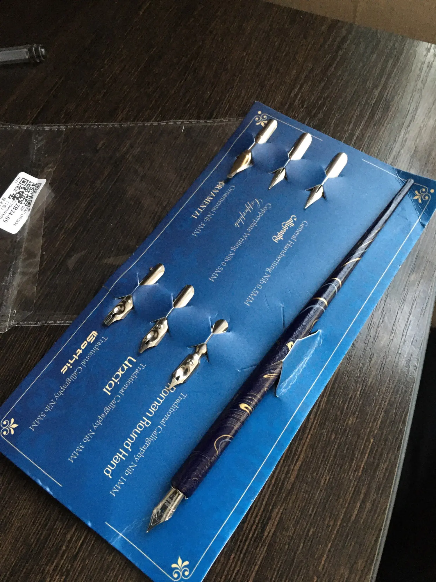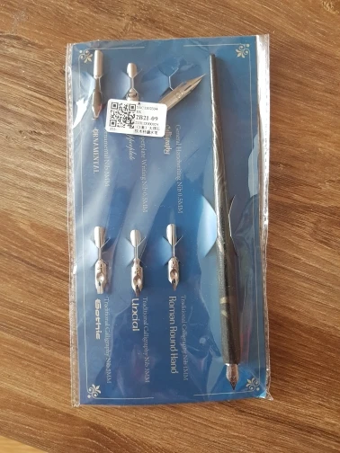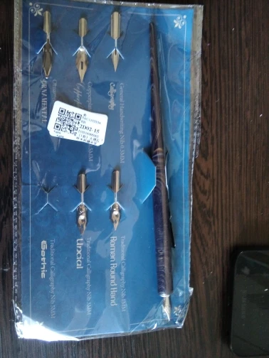 очень понравился. доставка за 2 недели. приятно лежит в руке. упакован был просто, поэтому перья не удержались на местах. сам держатель приклеен на силикон. очень удобный. линии везде ровные. чернил хватит на хорошее предложение только в 5 наконечнике. остальнве чисто для декора в каллиграфии