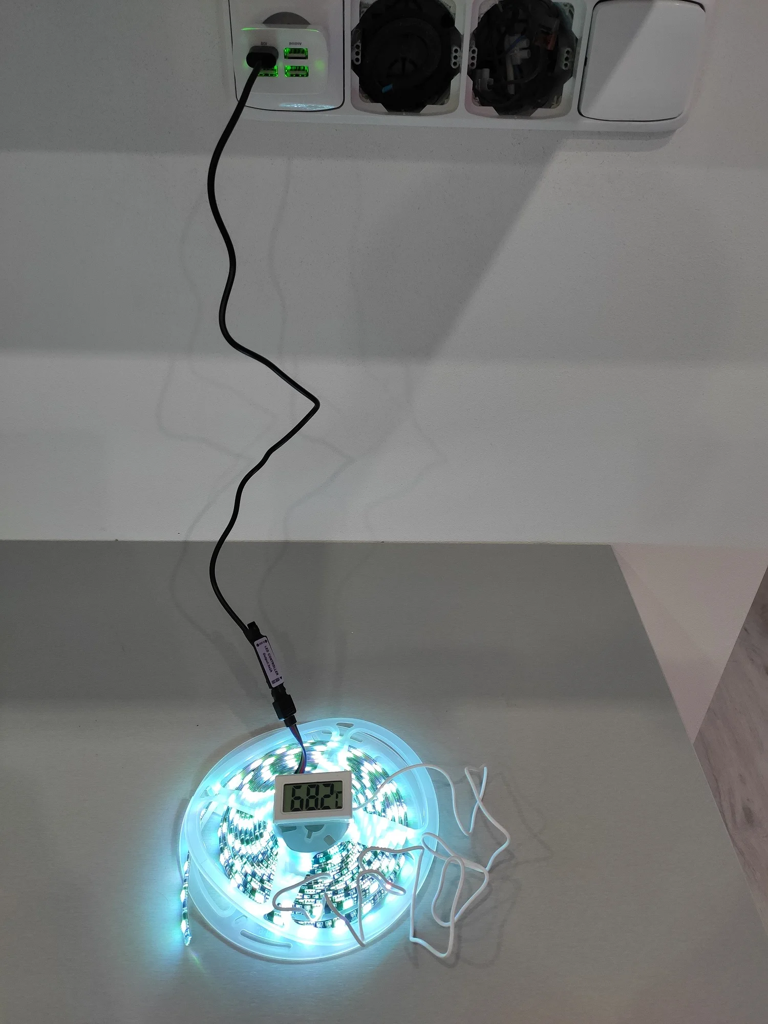Он много освещает и выглядит великолепно, жаль, что он не может быть настроен в белом цвете во всех других цветах, он может регулировать мощность с мобильного приложения по bluetooth и цвет сохранен мощность при выключении телевизора, Я очень доволен, я куплю больше (установка на телевизор Samsung 42 ")