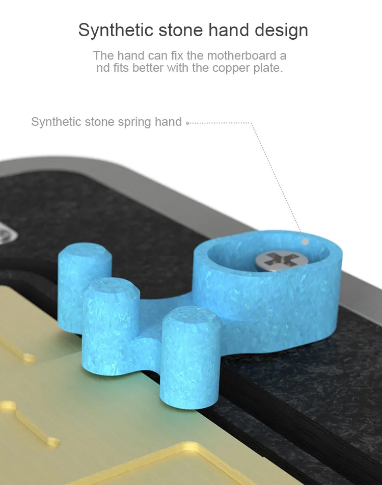Особенности 1. Постоянная температура, пористый отвод тепла, разделение одной кнопкой 2. Позиционирование в два шага. Безопасная разборка, съемная и сварная 3. Позиционирование помимо резервуара для клея, все виды сколов легко удаляют клей 4. Силикон полностью закрыт, не скользит, термостойкий для предотвращения утечки тока 5. Плотная посадка, высокоточная обработка на станке с ЧПУ, равномерный нагрев без повреждения материнской платы 6. Избегайте пустых слотов вокруг, Контролируйте температуру и технологию нагрева 7. Медная пластина высокой чистоты, расширенный дизайн, профессиональный инструмент для распайки