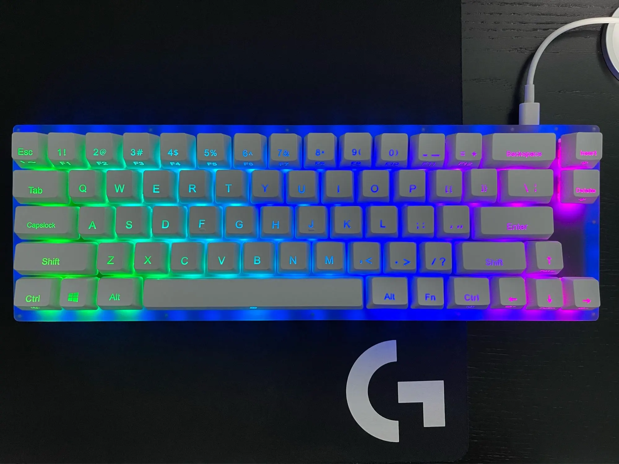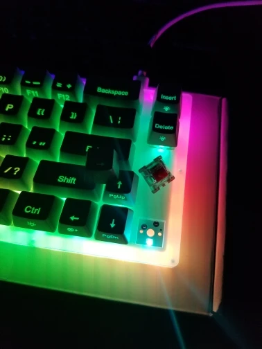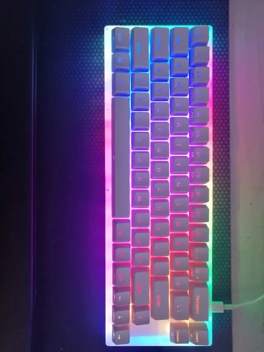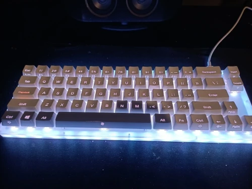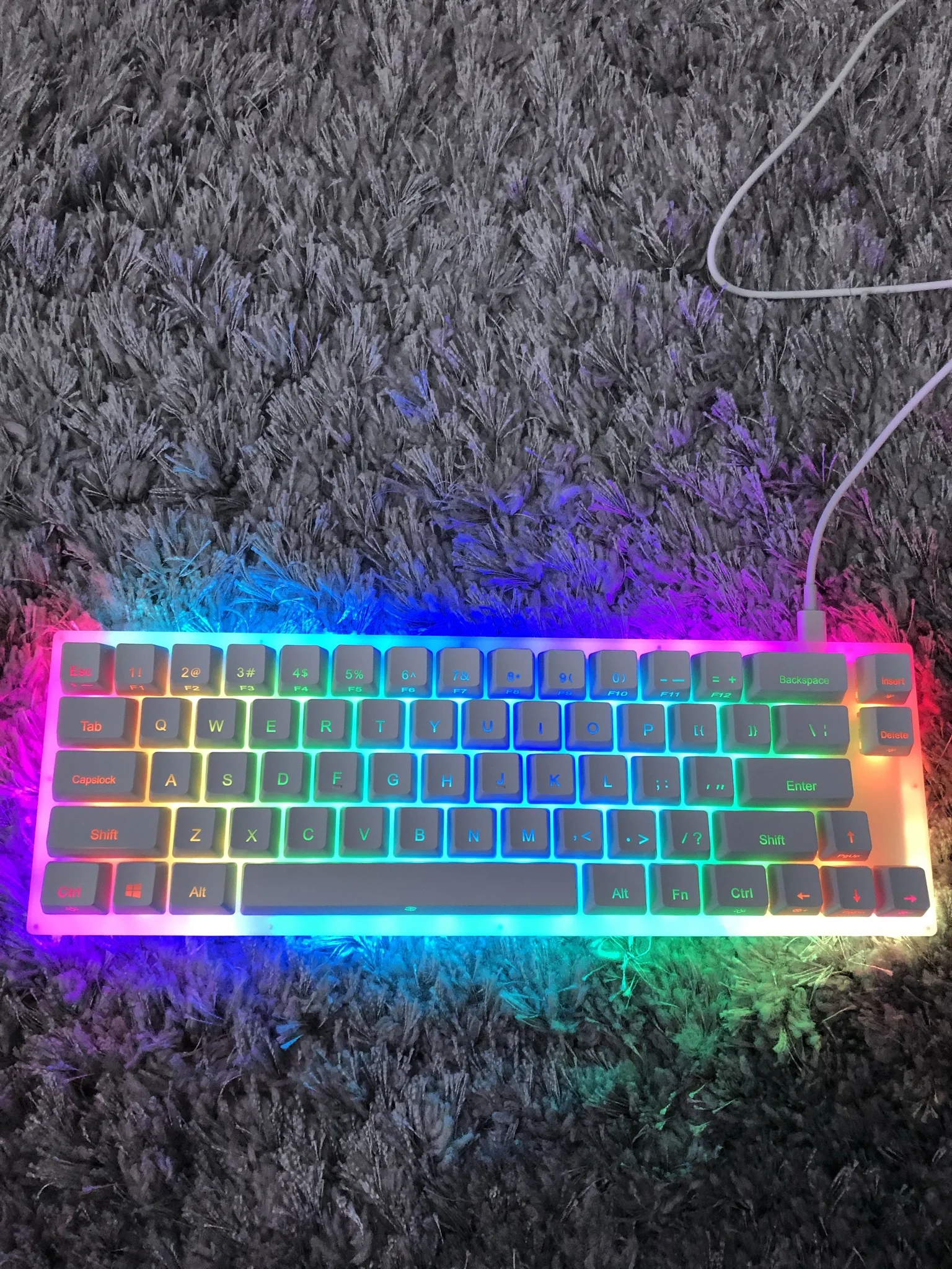 Чехлы для моей клавиатуры не были выровнены очень хорошо. Он сделан из 3 штук, зажатых вместе, и мои не были выровнены друг с другом. Это заметно на ощупь и видении. Я бы хотел, чтобы он был более выровнен. Кроме того, возможно, из-за транспортной компании, плата была немного сломана. Колпачки для ключей не являются наивысшим качеством, но, похоже, они просвечиваются, где свет не просвечивает. Некоторые колпачки имеют заметные трещины/швы, которые позволяют просвечивать свет. Режимы цвета и яркости на клавиатуре прохладные и визуально приятные. Матовый акрил рассеивает свет и блестит через всю панель. Есть независимые огни RGB для каждого индивидуального ключа и связка по всему корпусу. Съемный кабель USB C является основным плюсом. Мне также нравится, как доступны функциональные клавиши, 'ключ, ~ ключ, page down и page up, удерживая функциональную клавишу прямо из коробки. В колпачках также показаны соответствующие клавиши