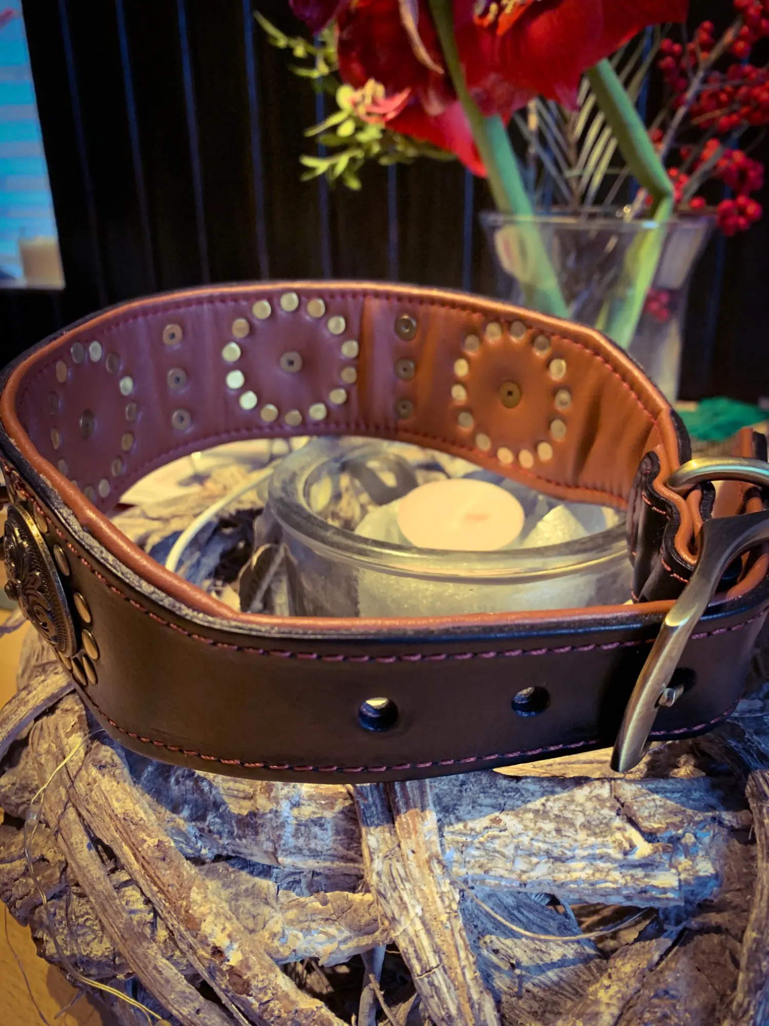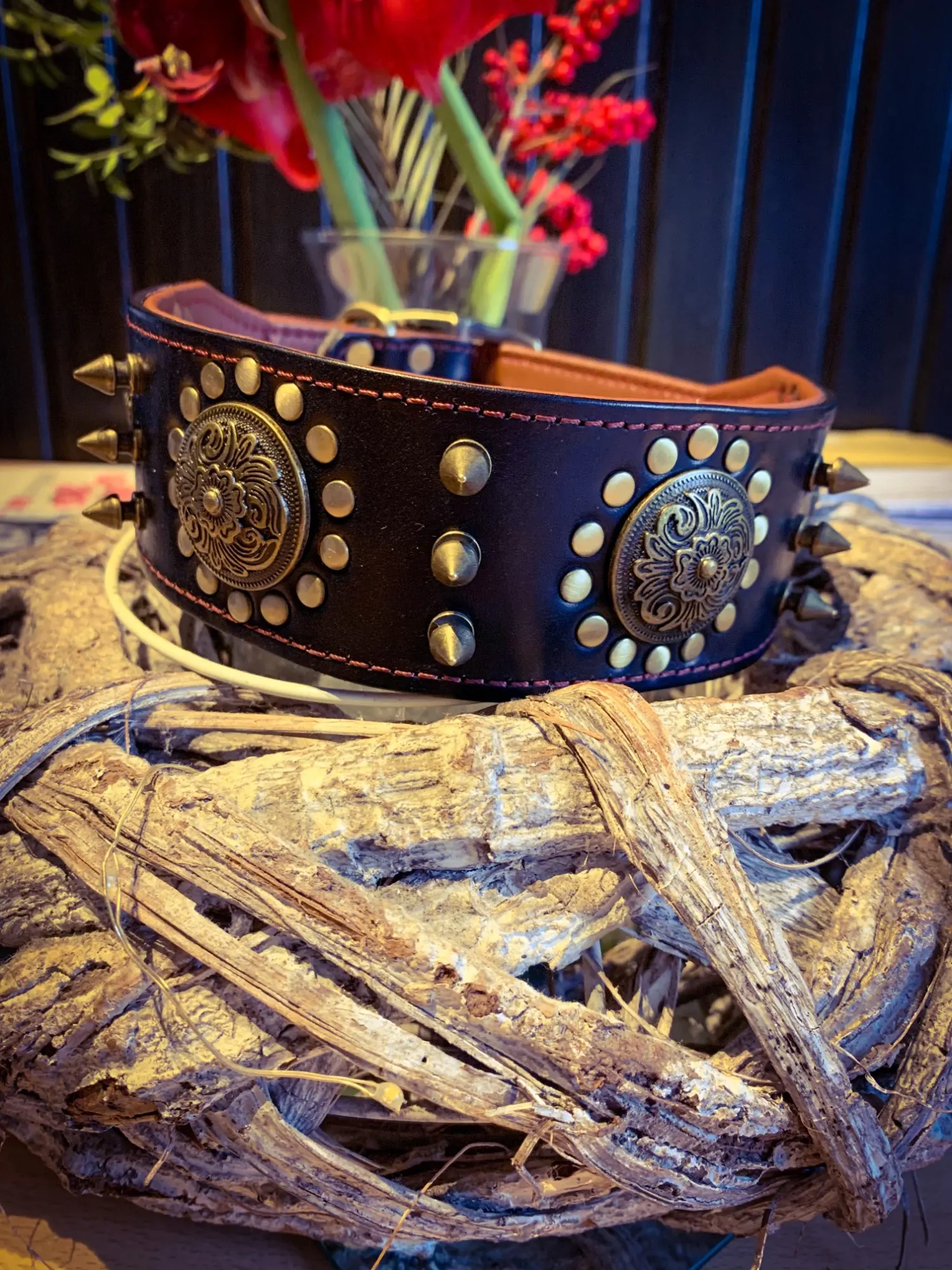 Прочный и Прочный воротник с шипами из натуральной кожи. Воротник изготовлен из прочной ткани с двойной строчкой для максимальной прочности вашего питомца. Прочное d-образное кольцо для ходьбы.