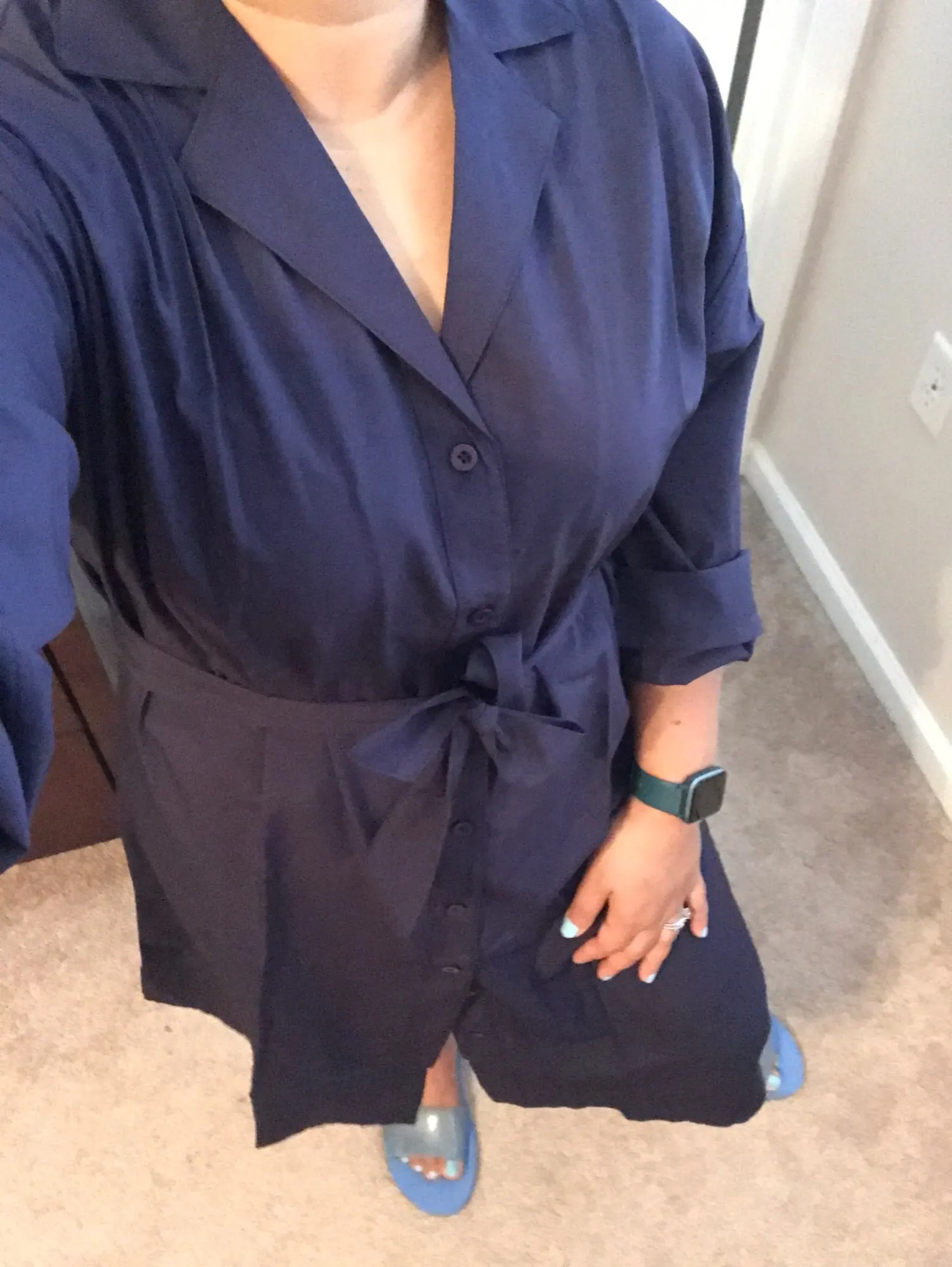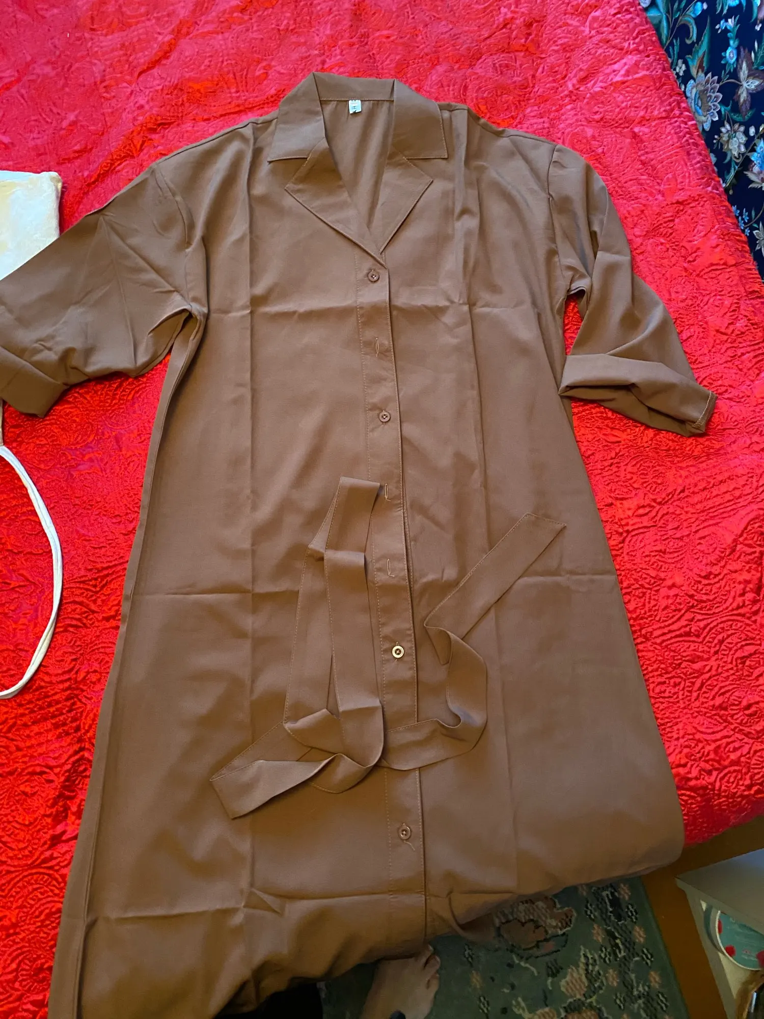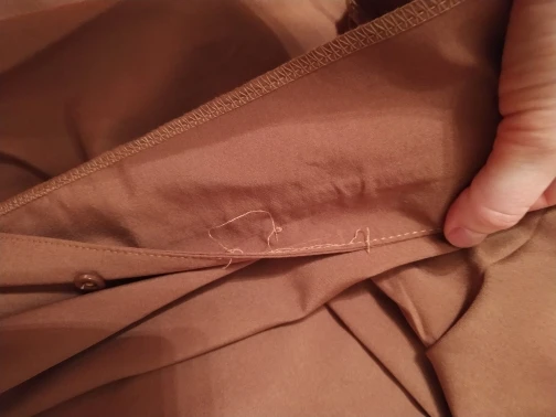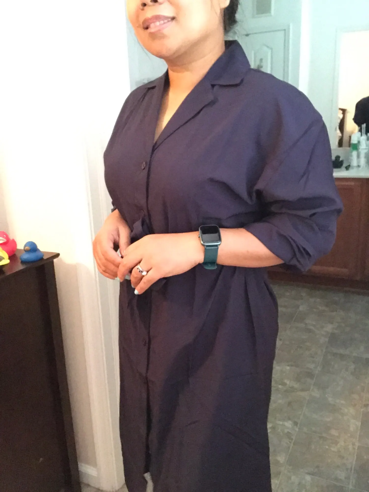 Когда получила товар не было времени осмотреть платье и открыть спор -уезжала в отпуск. Вот вернулась, осмотрела вещь, осталась очень не довольна. Воротник ужасно прошит, а это видимая часть платья, которую не скрыть. Также на плече обнаружила дырочку. Пуговицы лучше сразу же нормально пришить, т.к. есть опасность потерять пуговицы ещё при примерке.Такую вещь даже дома нет желания носить. По части фасона - на фото у продавца это не так сильно бросается, но видно в отзывах - воротник сшит как у рабочих халатов. По длине на рост 173 чуть ниже колена. Зря потратила деньги. К покупке не рекомендую.