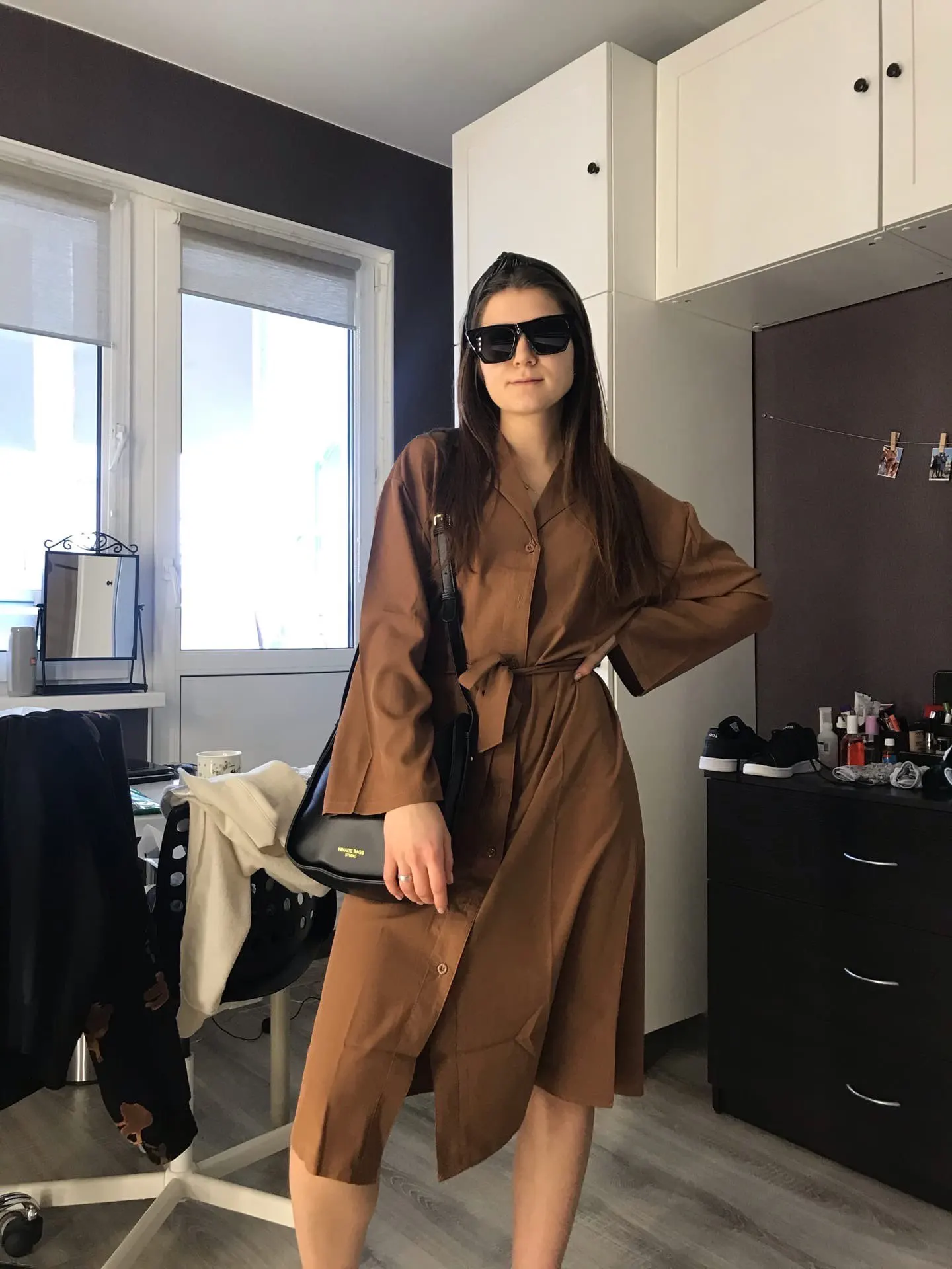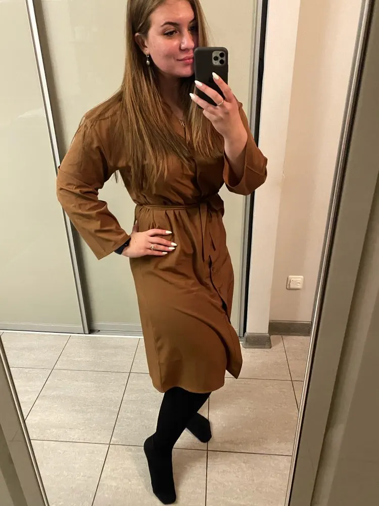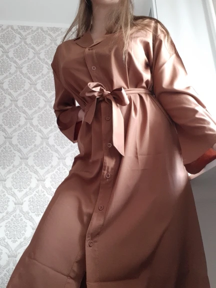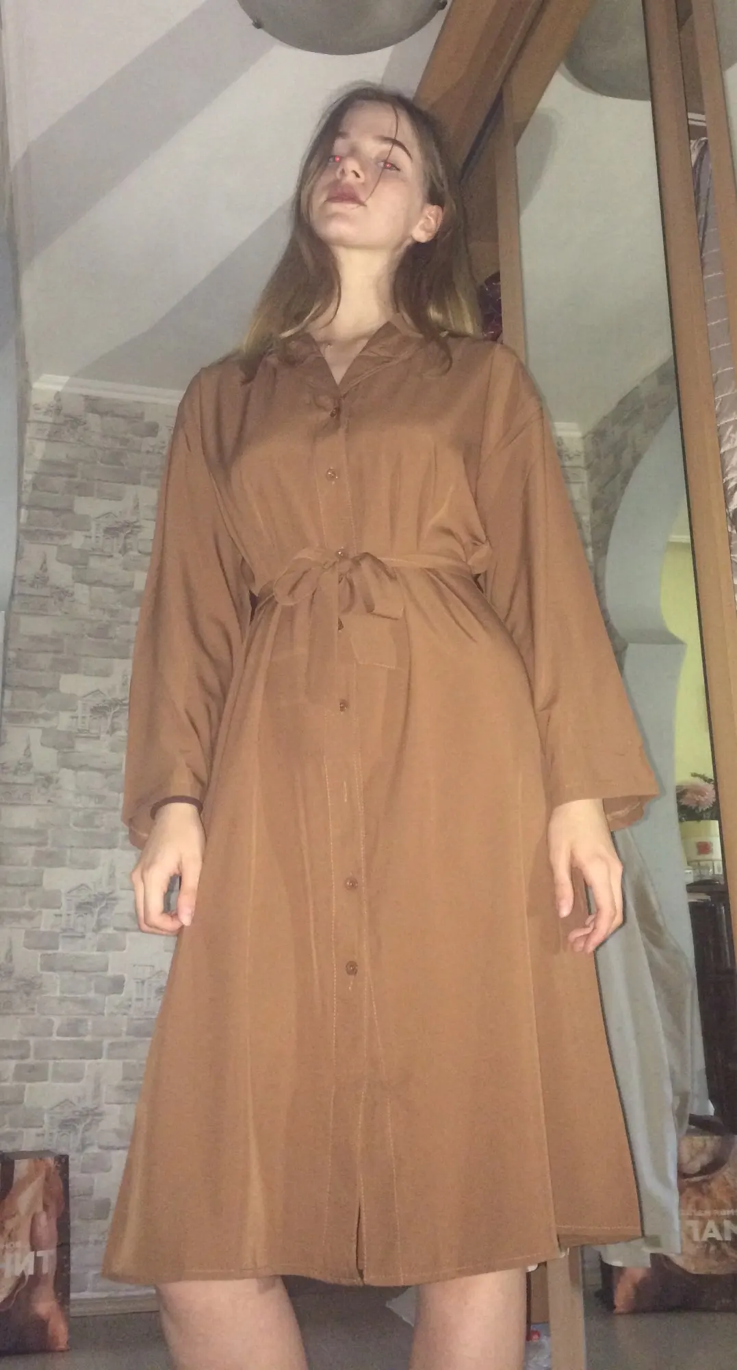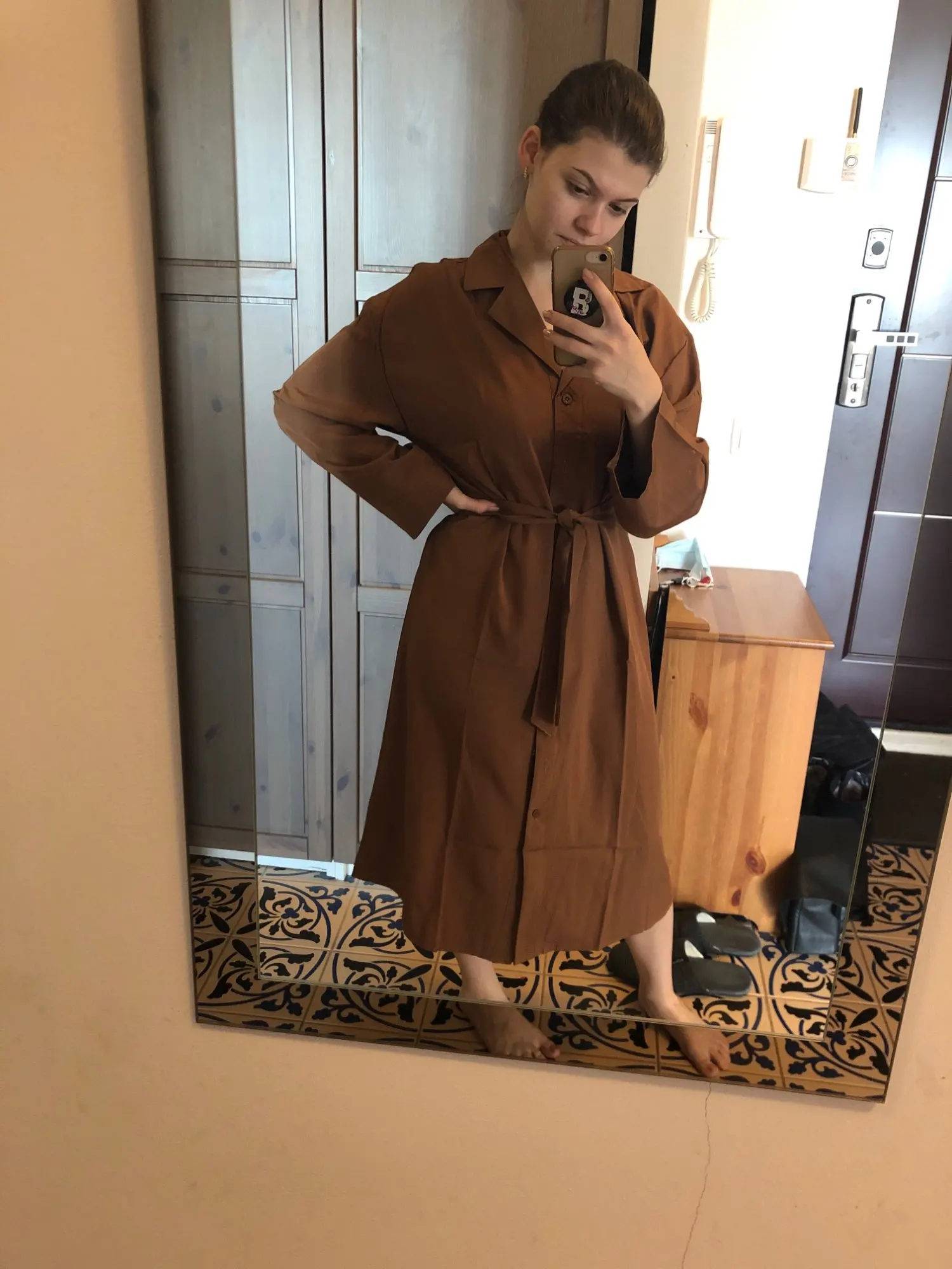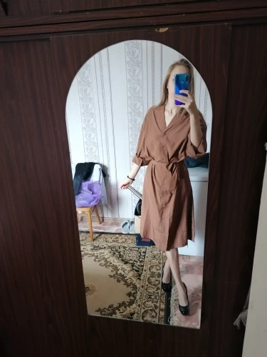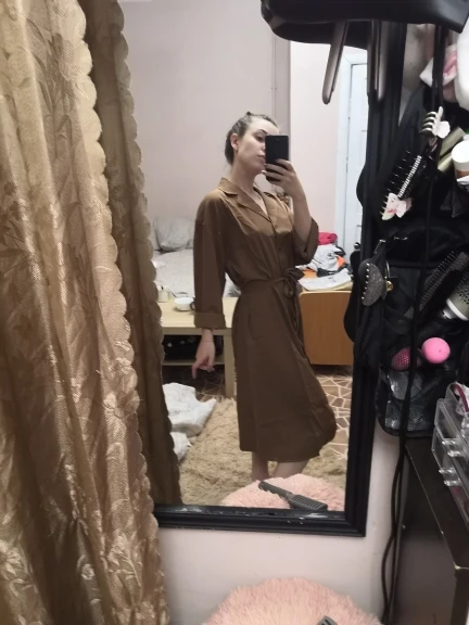 За свои деньги нормальное платье. Обыграть аксессуарами и будет хорошо смотреться. Понятно, что это синтетика. Довольно тонкое. На размер 42 рост 168 село хорошо. Кривые строчки на поясе (надо перестрачивать, поэтому открываю спор на небольшой возврат денег) и немного кривая где подол у платья (не очень заметно) остальные нормальные и нитки не торчат. Запаха и пятен нет. Цвет коричново-горчичный. Рукова лучше закатать на 2 оборота, так смотрится гораздо лучше