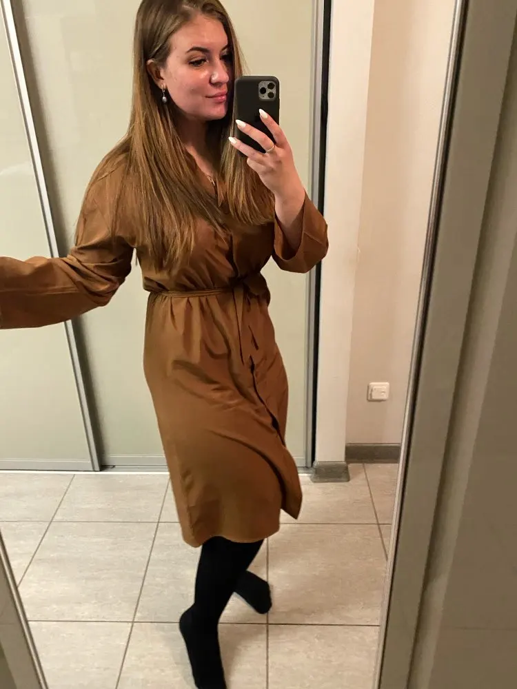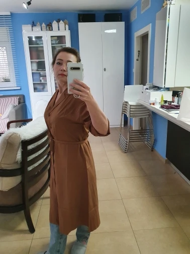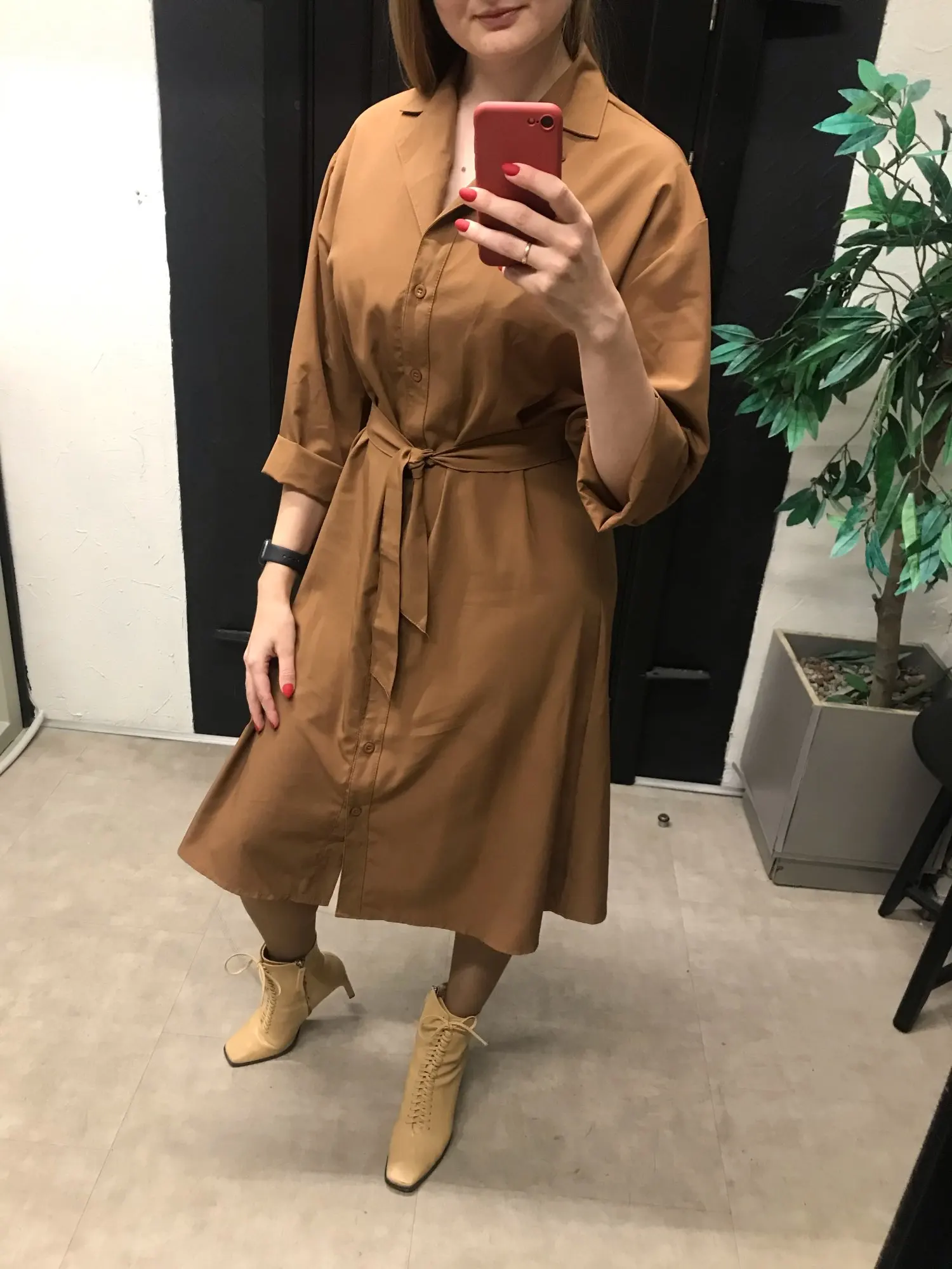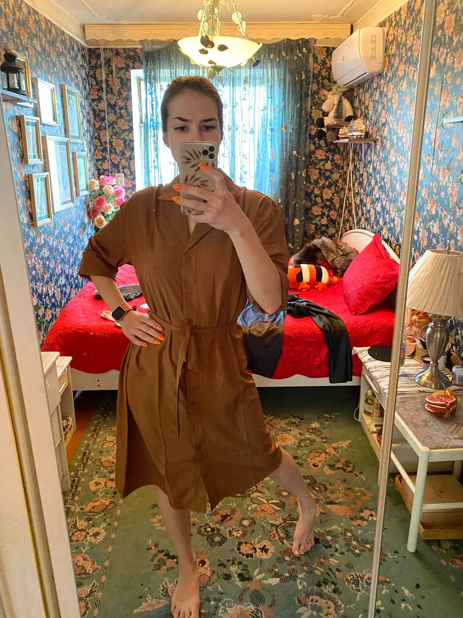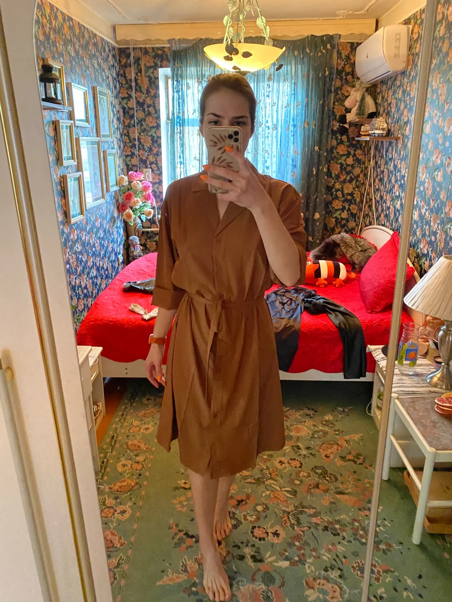За свои деньги нормальное платье. Обыграть аксессуарами и будет хорошо смотреться. Понятно, что это синтетика. Довольно тонкое. На размер 42 рост 168 село хорошо. Кривые строчки на поясе (надо перестрачивать, поэтому открываю спор на небольшой возврат денег) и немного кривая где подол у платья (не очень заметно) остальные нормальные и нитки не торчат. Запаха и пятен нет. Цвет коричново-горчичный. Рукова лучше закатать на 2 оборота, так смотрится гораздо лучше