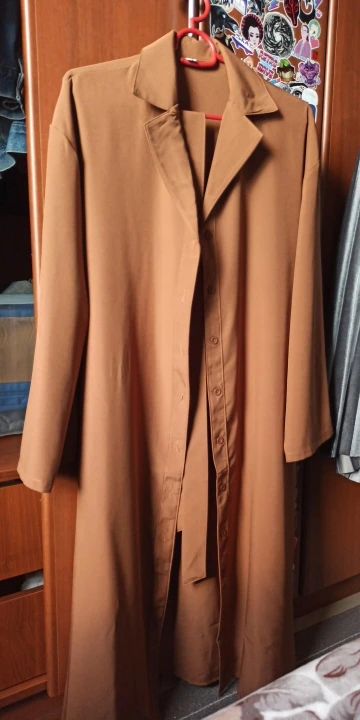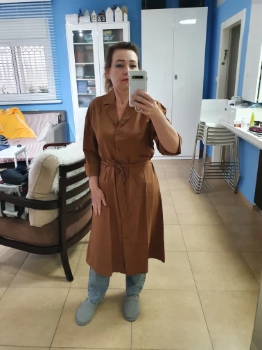Ткань нормальная по качеству(не что-то супер конечно), но мне кажется плечи низковато хотя хз, может так и надо, если закатать рукава, с поясом выглядит норм, без пояса выглядит как плащик. На рост 172 длина ниже колена, в этом очень довольна, хотя и можно наверное было заказать на размер меньше. за такую цену очень даже оправданная покупка)