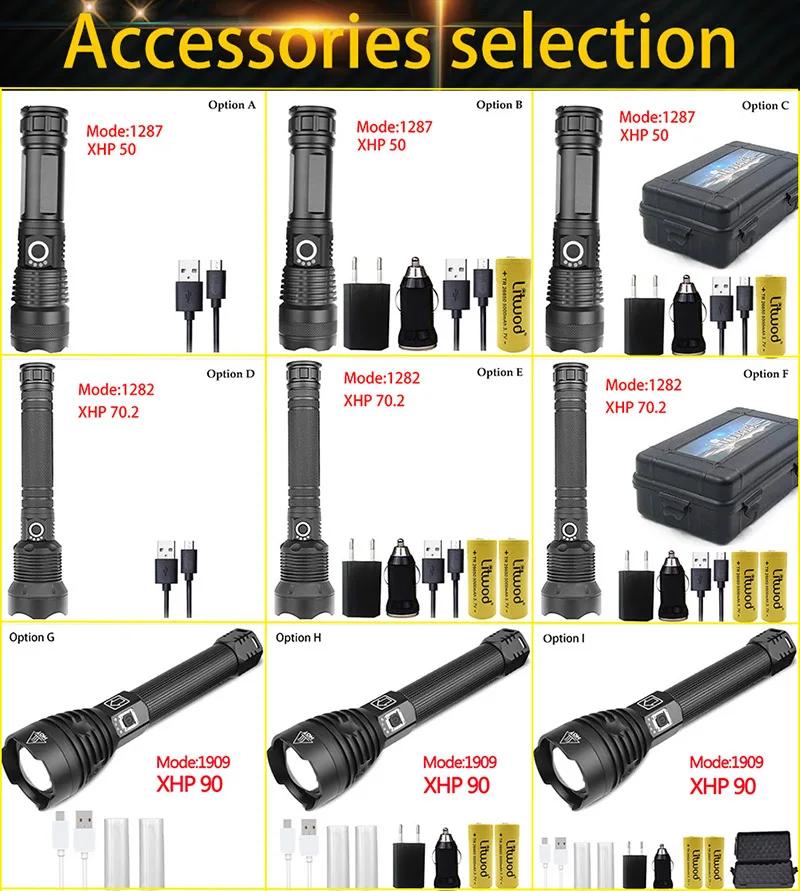 Вариант H: Фонарик (1909)+ USB + зарядное устройство + 1*26650 батарея + Автомобильное зарядное устройство + вилка (ЕС/США)Вариант I: Фонарик (1909)+ USB + зарядное устройство + 1*26650 батарея + Автомобильное зарядное устройство + вилка (ЕС/США) + ящик для инструментов