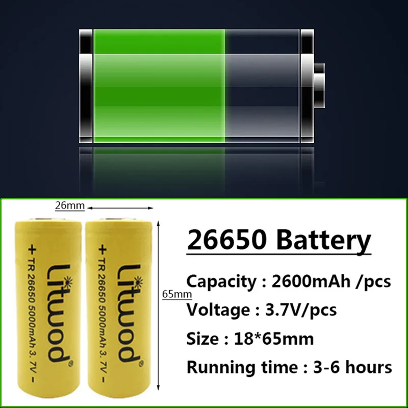 26650 : 15 часов (26650 5000 мАч/шт. Желтый цвет батареи)