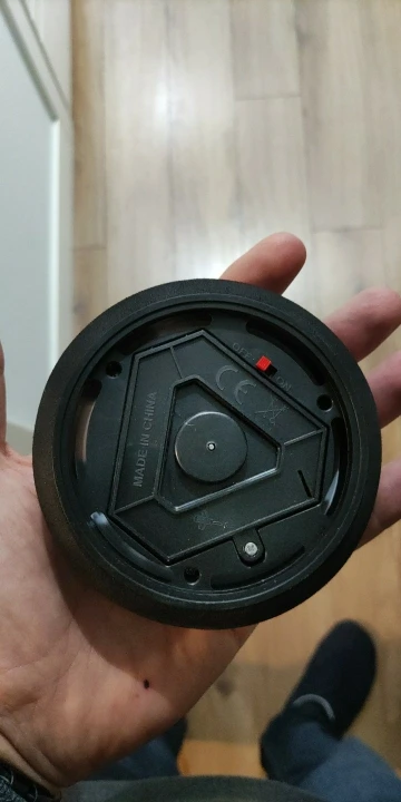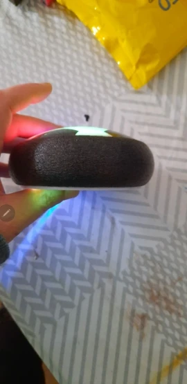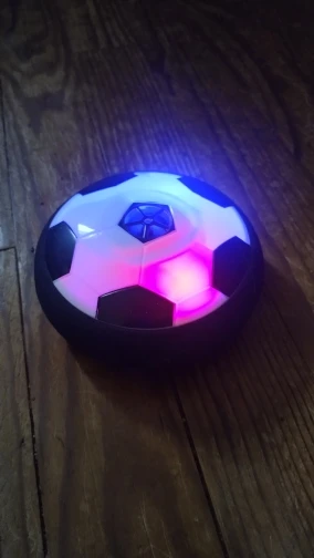 Сверху тёмное покрытие похоже на замшу, оно оказалось немного потёртым, но это сразу перестаёшь замечать, когда вставляешь батарейки и включаешь. Игрушка подсвечивается разными цветами, играть очень круто. Принцип похож на игру в аэрохоккей.