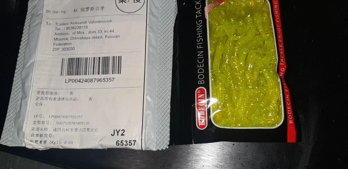 Товар пришёл в Москву 19 сентября. Заказ сделан 28 августа. Получил на почте. Описание товара соответствует. С продавцом не общался без необходимости в этом. Трек номер изменился. Без отслеживания. Приманки рабочие и съедобные. Силикон мягкий. Работают. ♥️