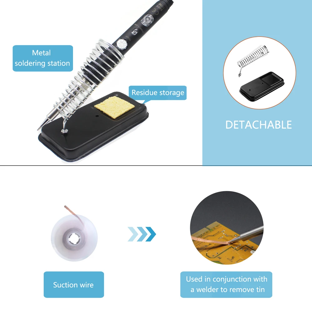 1. Он поставляется с Сумка для переноски инструмента, паяльник (с 1,5 м кабель питания), 5 припоя Советы, пайки присоски, 2 шт набор пинцетов, проволочного припоя, подставка для паяльника с чистящей губкой, он может удовлетворить все ваши запросы на сварку, используя все детали, которые входят в комплект, что делает вашу пайку более легкой и удобной.