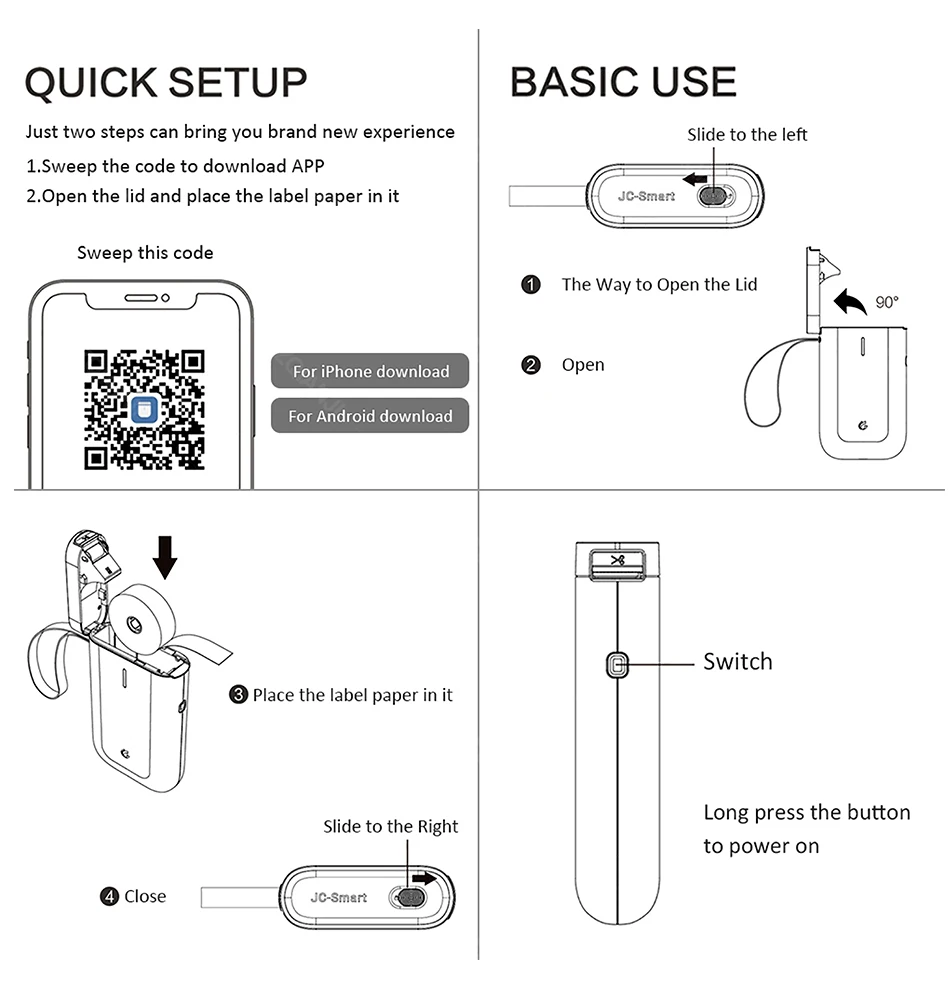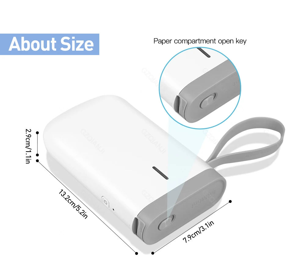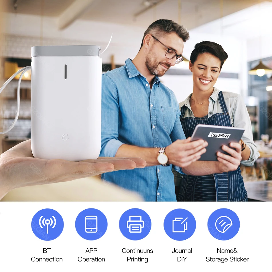 Беспроводной дизайн, поддерживает печать на большие расстояния.Беспроводное расстояние до 10 м.Прямой тепловой, без чернил, тонера или лент.Поддерживает все основные форматы этикеток: цена, дата, размер, вес, имя и т. д.Универсальный, простой в использовании.Компактный и легкий, удобный для переноски.Аккумулятор емкостью 1200 мАч поддерживает длительное использование.Характеристики: