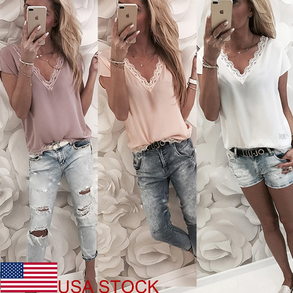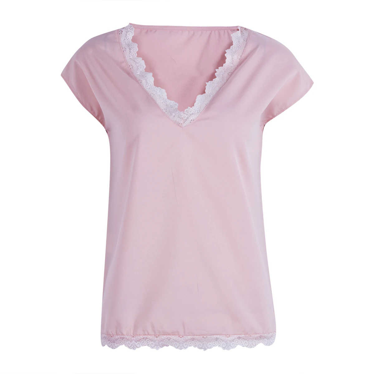 Модная женская однотонная кружевная блузка с коротким рукавом и V-образным вырезом