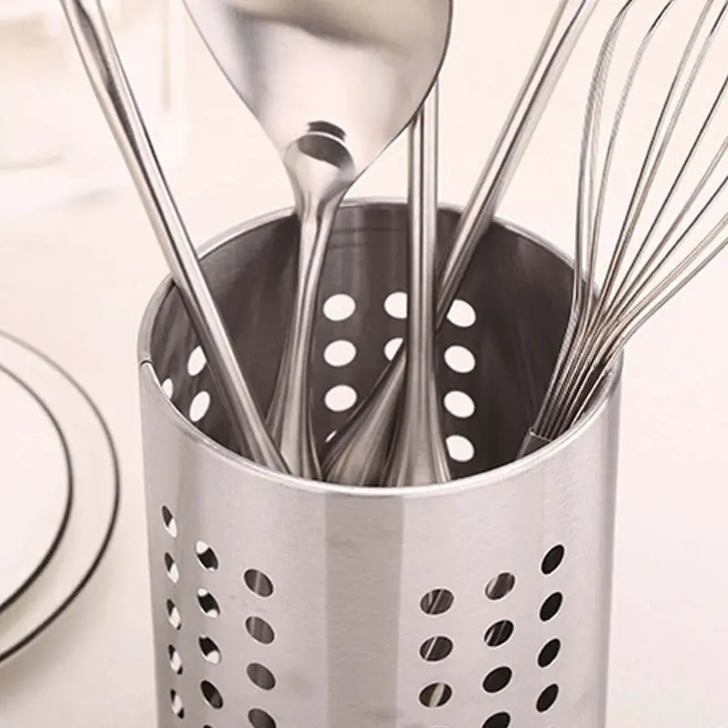 Вы беспокоитесь о том, как разместить кухонные инструменты? Палочки для еды, инструмент для нарезки, яичный венчик, ложки, вилки, инструменты для приготовления пищи, кисти и т. д. теперь эта практичная посуда crock поможет вам решить эти проблемы. Изготовлен из высококачественной нержавеющей стали, антикоррозийный, износостойкий и прочный. С отверстиями на дне и части тела, он может сливать воду и держать вещи сухими. Многоразовое использование для хранения палочек для еды, вилок, инструментов для приготовления пищи, кистей для вашей кухни или ванной комнаты.