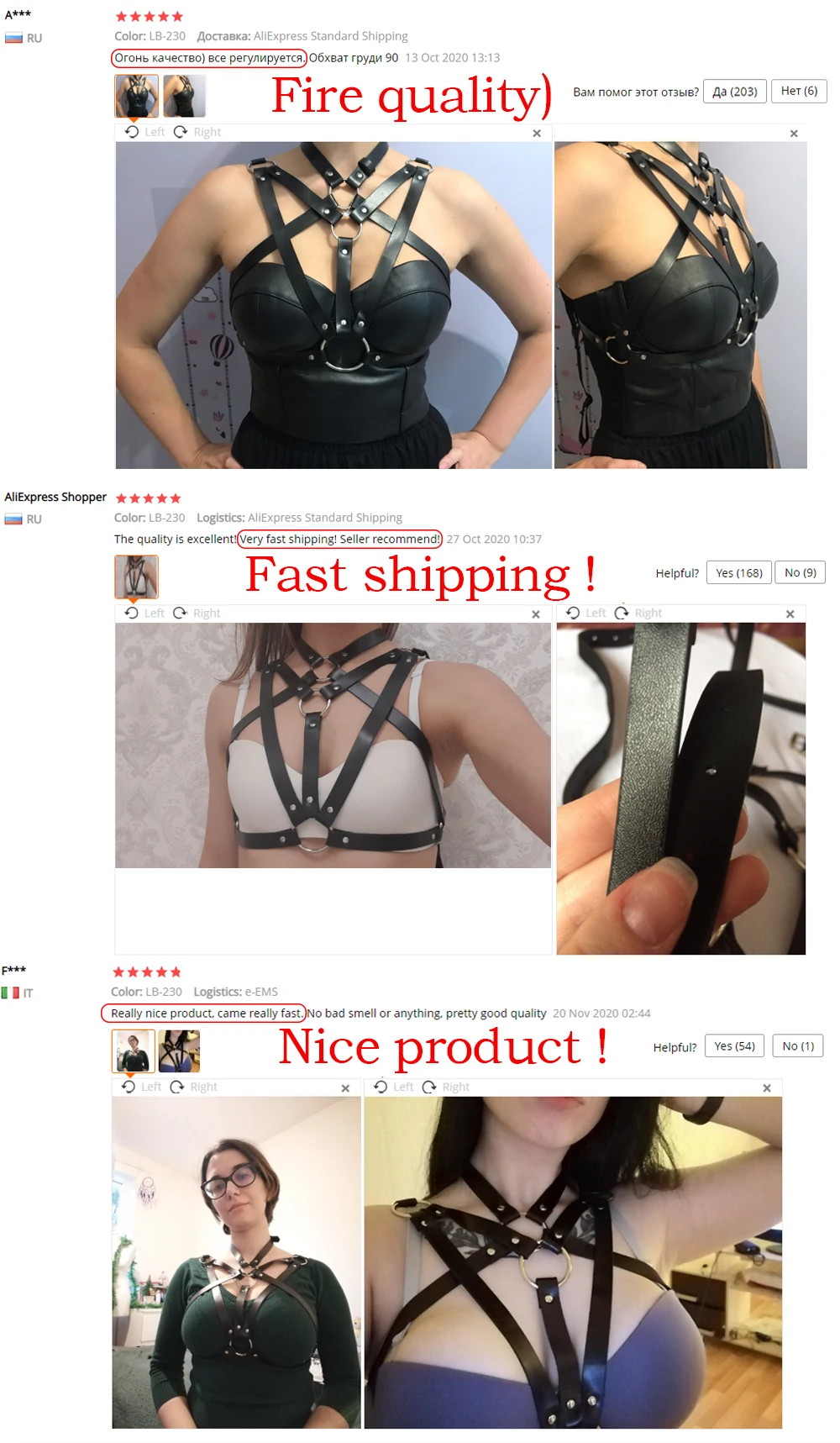 Вообщем товаром довольна, заказывала для фотографий. По центру правда не очень красиво ремешки ложились (это скорее всего из-за небольшого размера груди 75В) и я отрезала три лямочки. Так даже больше нравиться. Если не хотите инвестировать в такие элементы одежды много денег, то могу советовать.