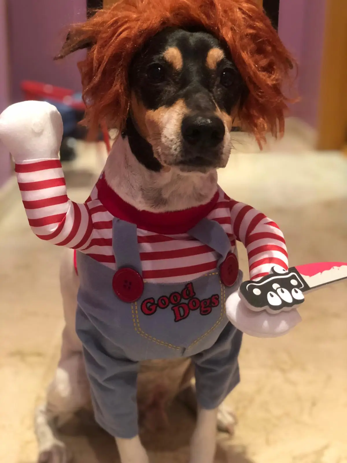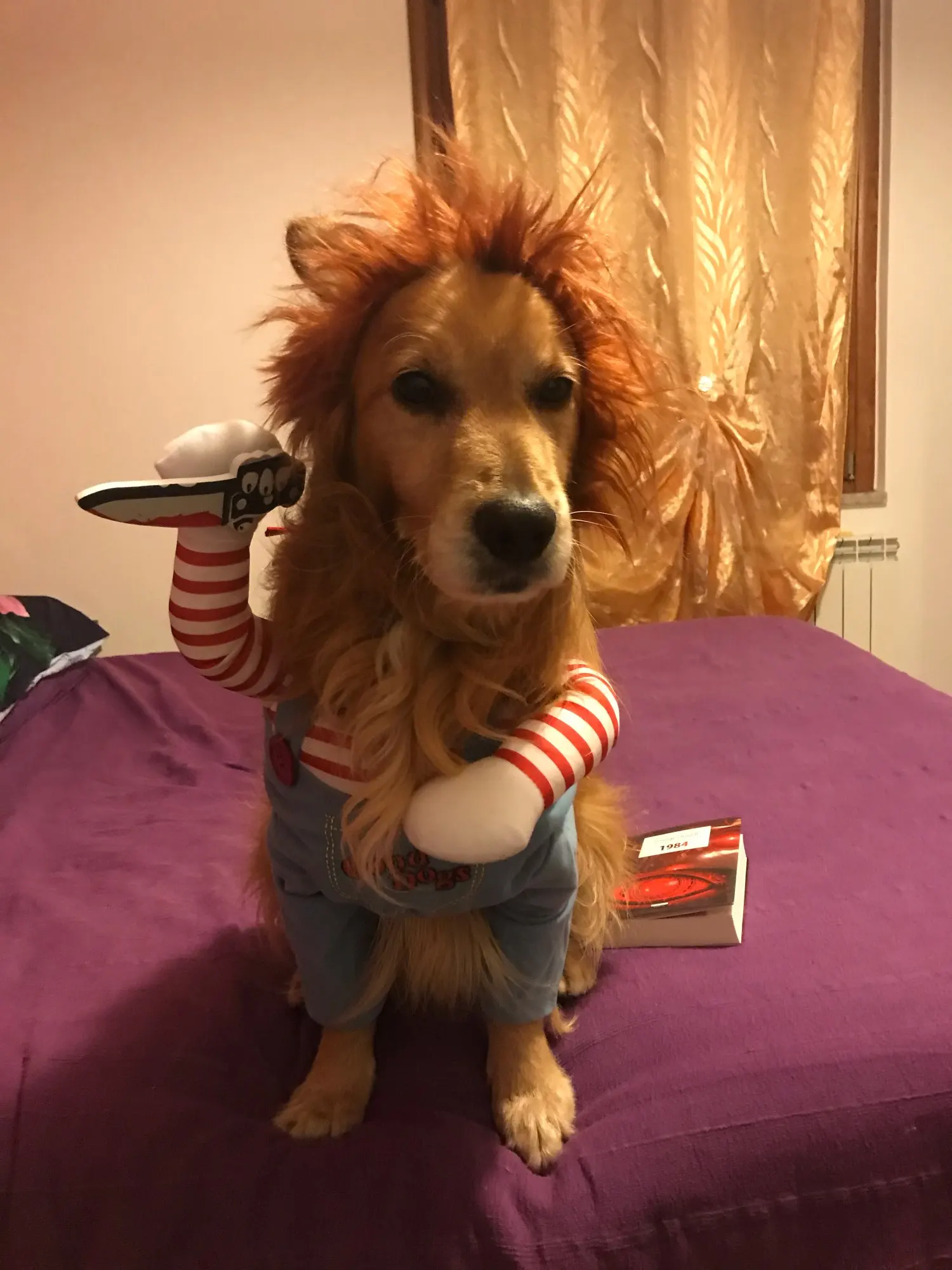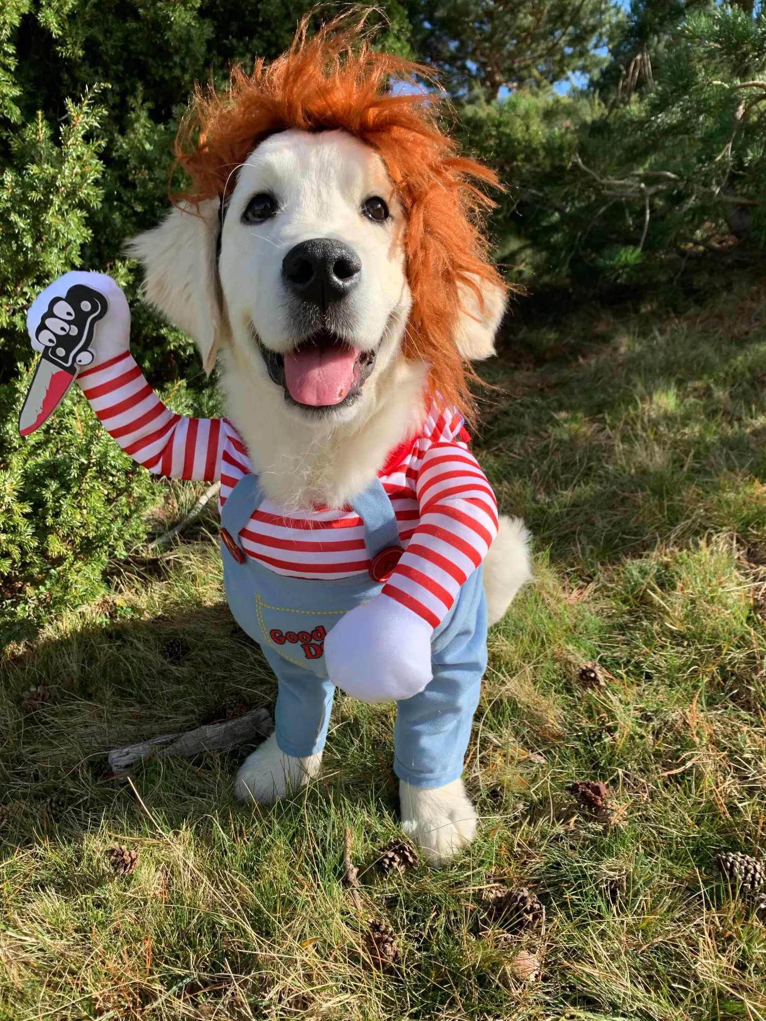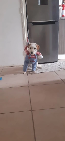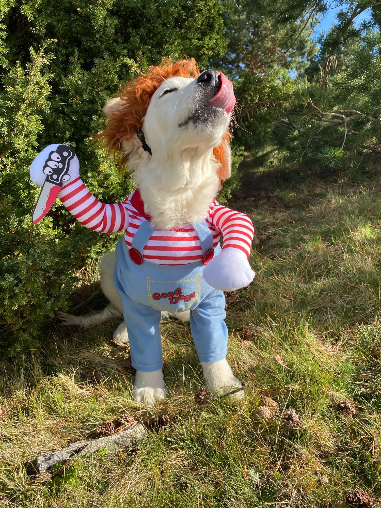 По размеру костюм подошёл (собака небольшой Джек рассел), все детали костюма без деффектов, в парике отверстия для ушек (при открытии пакета, выпала маленькая прядь волос, но на парике это не отразилось) и регулируемая резинка, нож на липе. Костюм завязывается на два бантика. Собака в шоке, а мы довольны