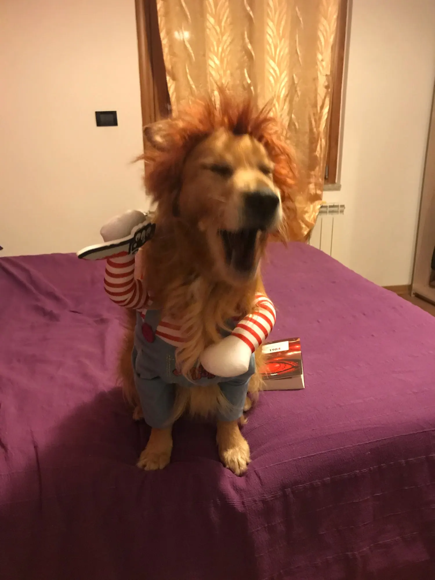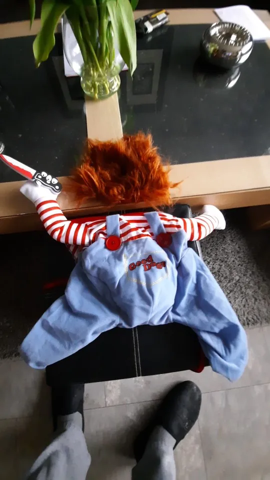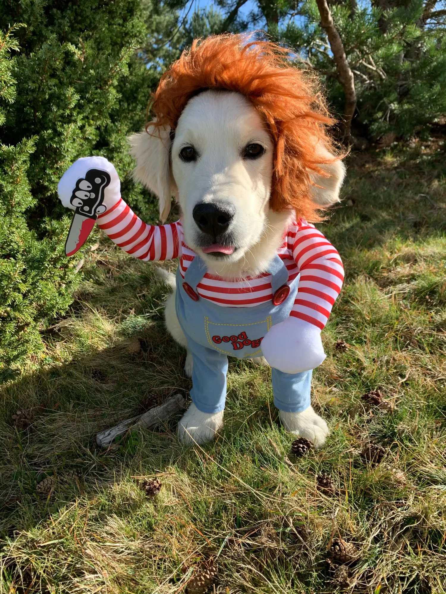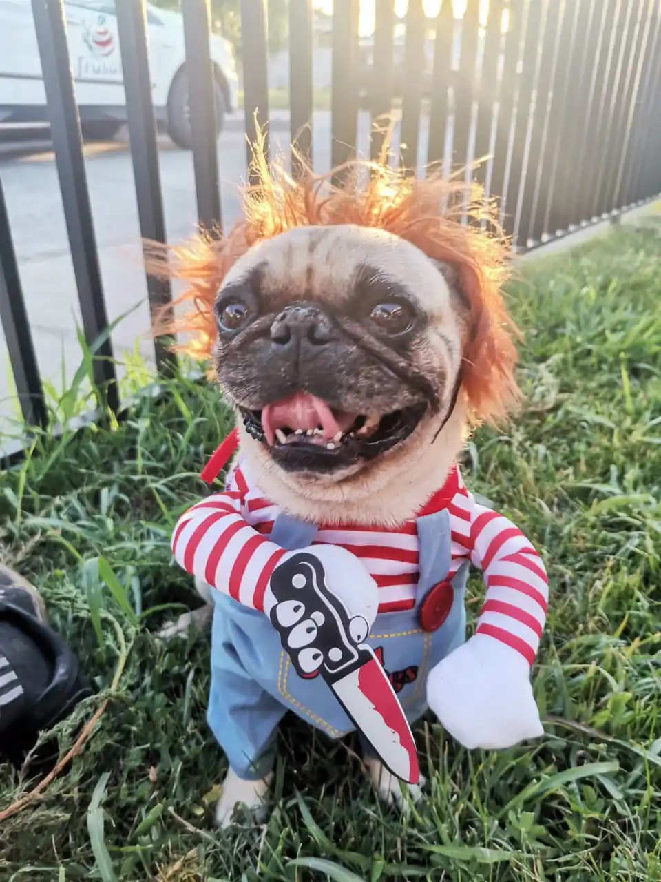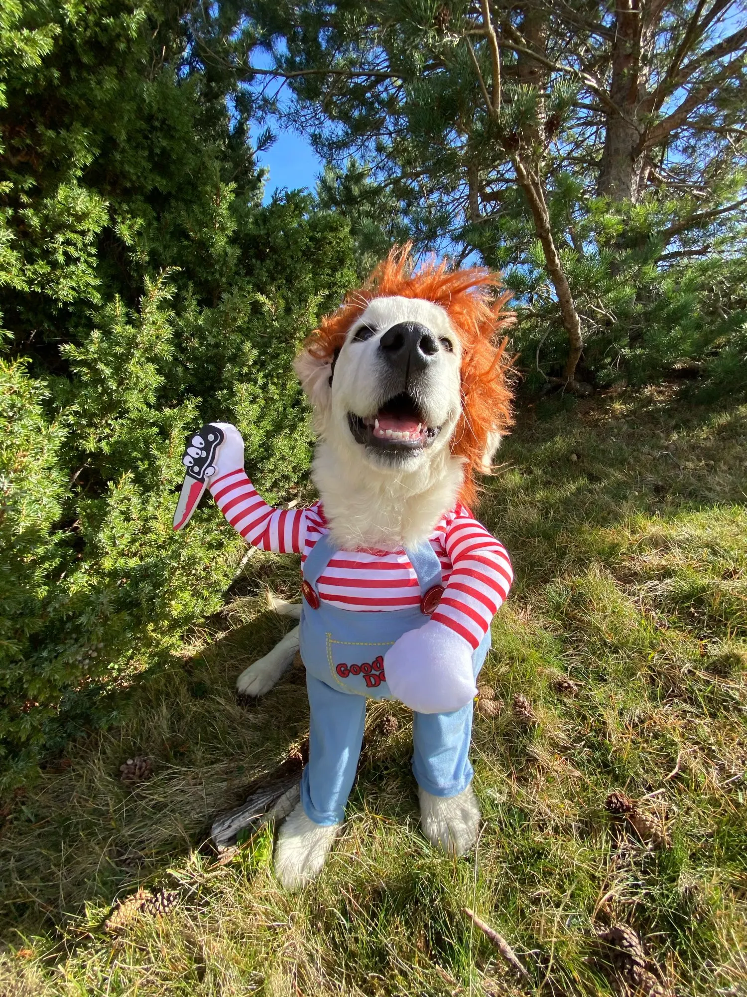 По размеру костюм подошёл (собака небольшой Джек рассел), все детали костюма без деффектов, в парике отверстия для ушек (при открытии пакета, выпала маленькая прядь волос, но на парике это не отразилось) и регулируемая резинка, нож на липе. Костюм завязывается на два бантика. Собака в шоке, а мы довольны
