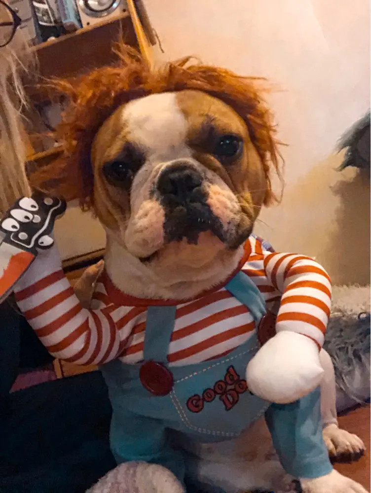 Отличный костюм. На моего бульдога, 15 кг подошёл s размер, у неё грудь 58 см. На груди веревочки коротковаты но завязать можно. Уж очень ей нравится грызть руку с ножем, берет в зубы ее и ходит так