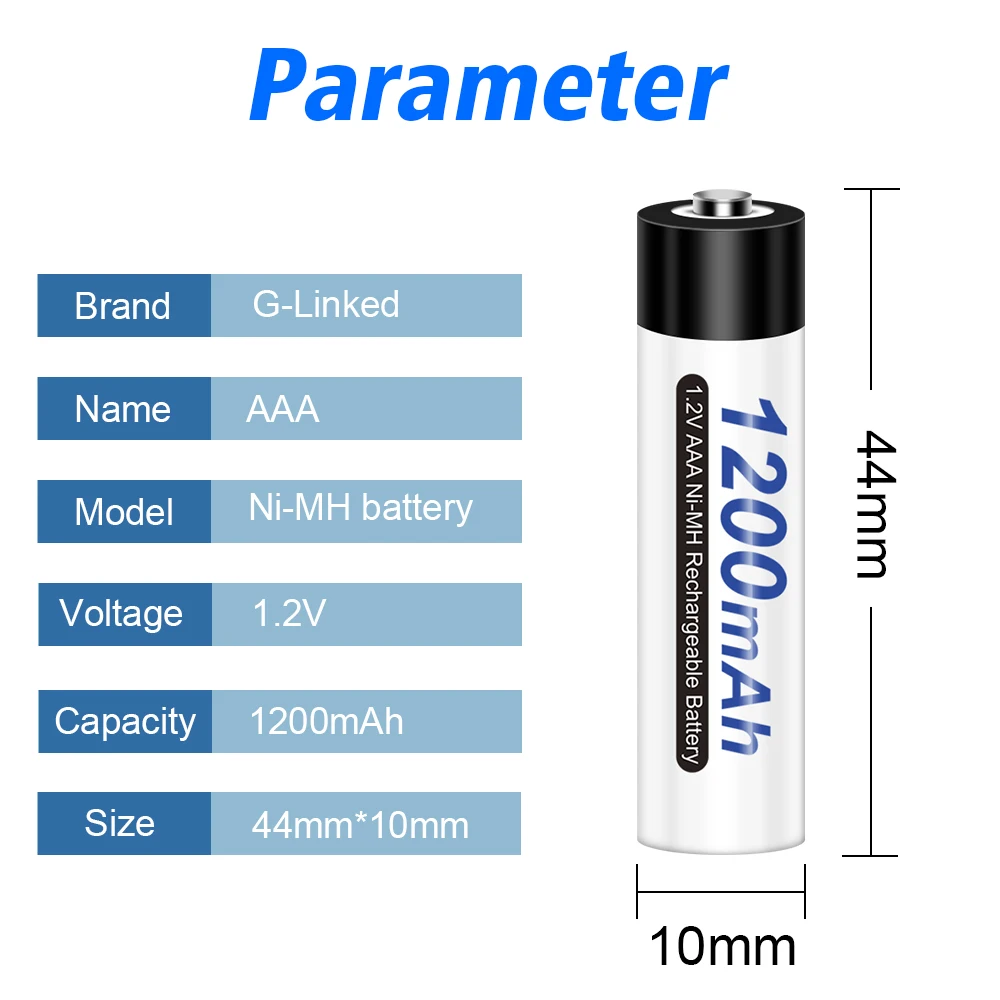 Тип батареи: 1,2 в Ni-MH AAAАккумуляторная батареяБренд: G-LinkedМодель: ni-mh 1,2 V AAAРазмер: AAAНапряжение: 1,2 VНормальная емкость: 1200 мАчРазмер (макс.): Диаметр: 10,5 мм * Высота: 44,5 ммСтандартный ток заряда: 100 мА время: 15 чТок быстрой зарядки: 344ма время: 4 чПрименение: цифровая камера, портативное видео, игра, фонарик, дистанционное управление, игрушка, MP3/MP4 плеер, электрическая бритва и т. Д.