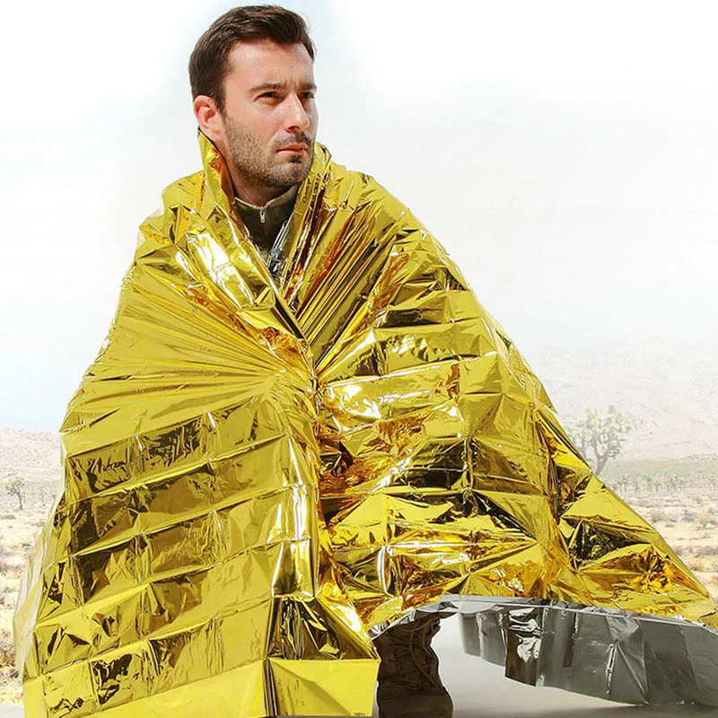 Это спасательное одеяло из фольги помогает удерживать тепло тела в чрезвычайных ситуациях.