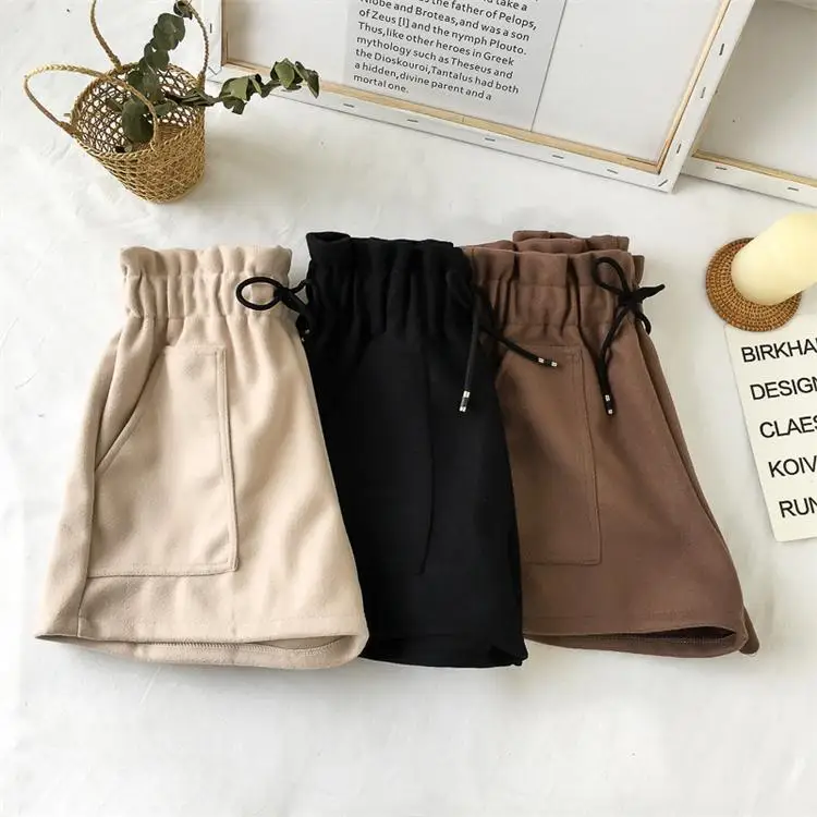 Шорты женские шерстяные, с высокой талией, широкие, черные, однотонные, повседневные, утепленные, на осеньзиму, 2021