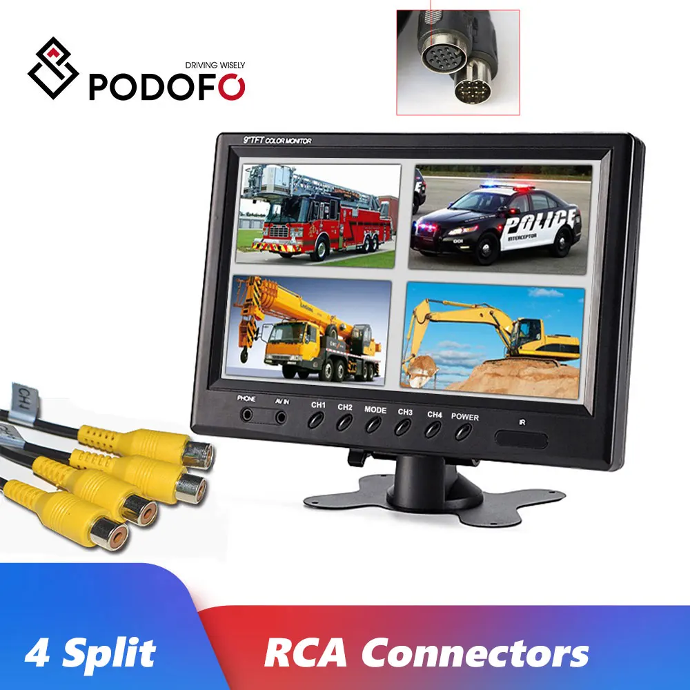 Podofo 9 "ЖК-экран, четырёхъядерный монитор видеонаблюдения, Автомобильный подголовник, монитор заднего вида, 4 RCA коннектора, 6 режимов