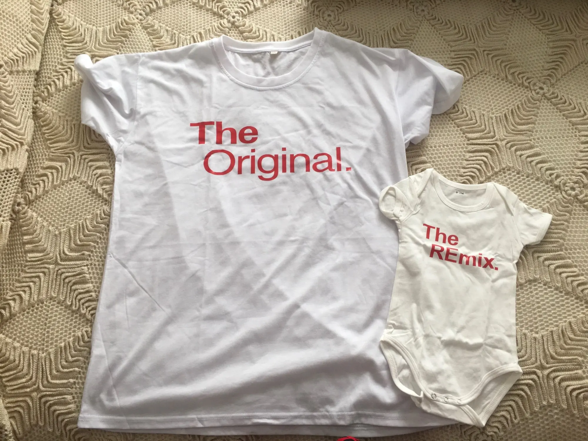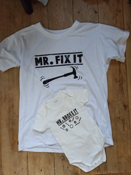 Baby's bodysuit I ordered for 6-9 months old and still waiting to try it on him as it's too big at the moment, he needs to grow to it :D material is not soo breathable so I wouldn't put it on him for too long. Otherwise I'm happy with both dad's t-shit and baby's bodysuit.