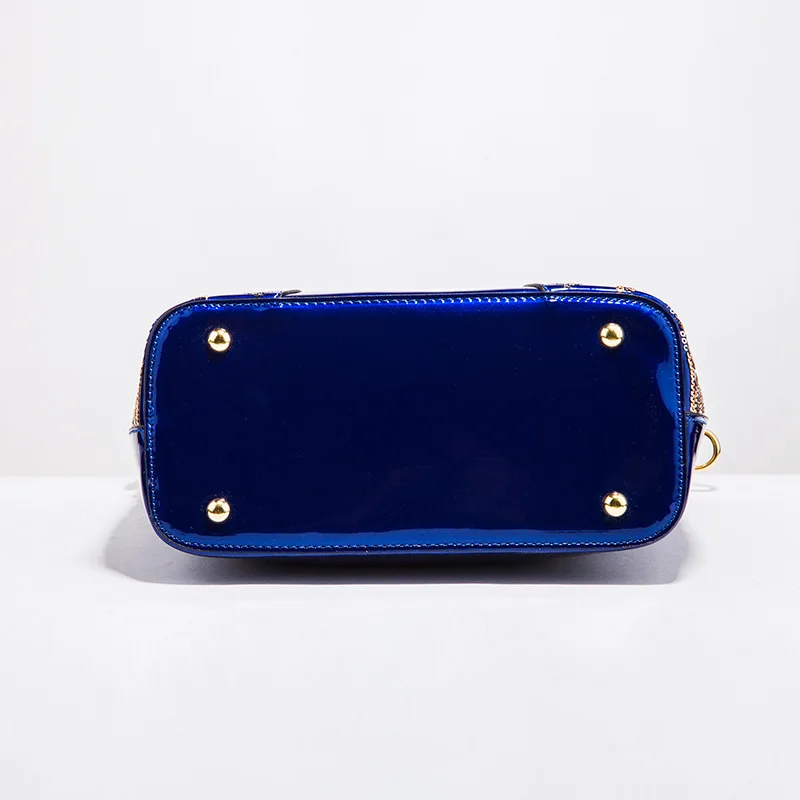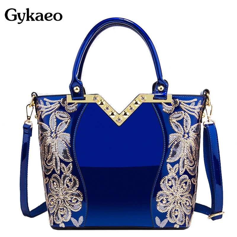 Gykaeo 2022, Европейская и американская Сумка-тоут с цветочной вышивкой, женская синяя сумка-мессенджер из лакированной кожи, сумка через плечо