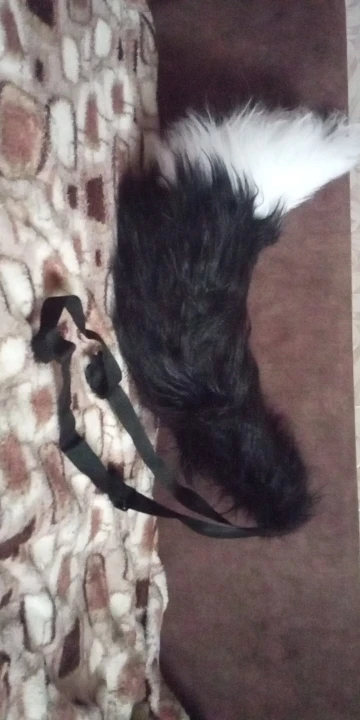 хвостик пришёл быстро, в пакете, мех очень лохматый, но это не проблема, можно расчесать, ремень удобный, всем довольны