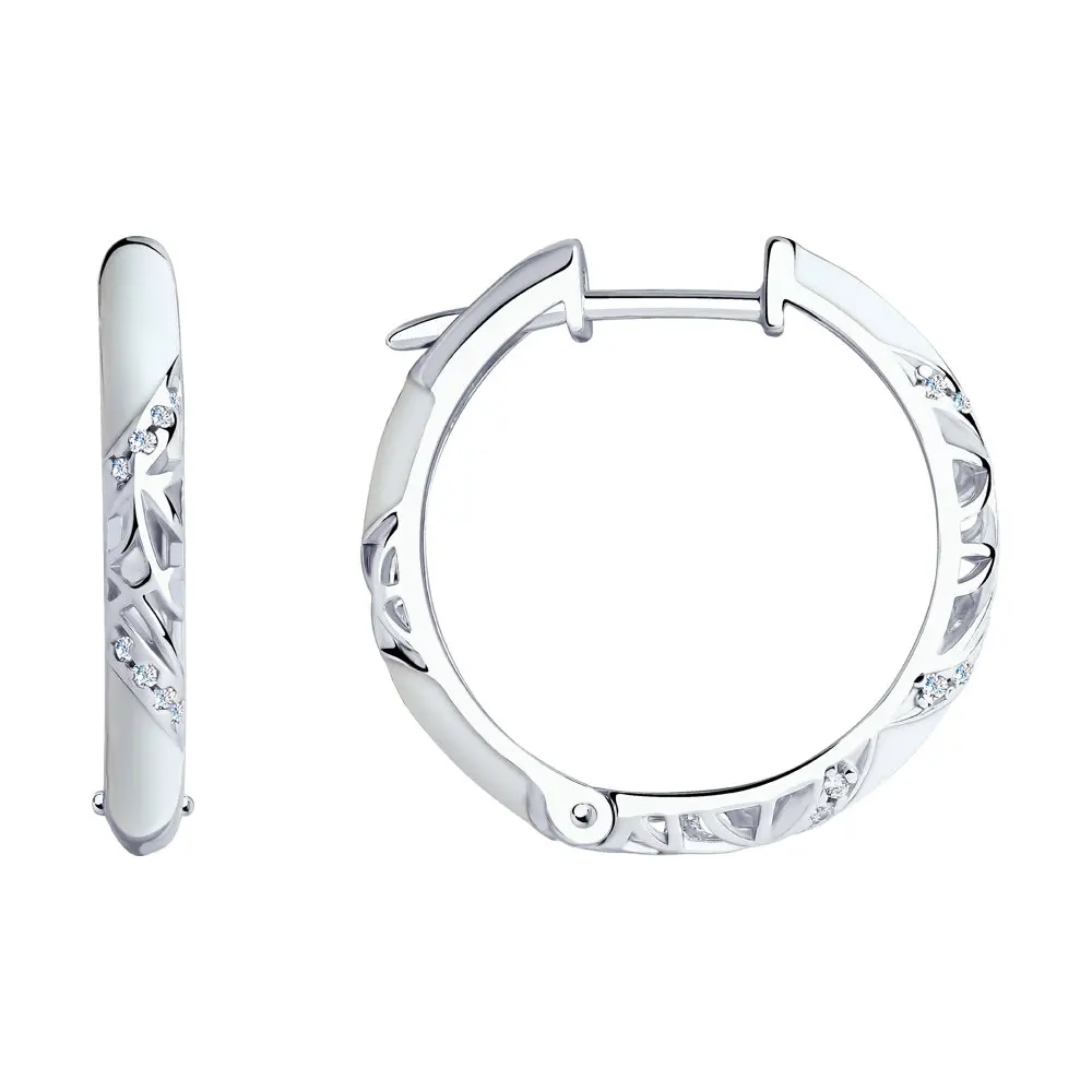 Серьги-кольца с белой эмалью SOKOLOVПоклонницы украшений «с изюминкой» сходу отметят необычный декор этих серебряных серёг-колечек. Эмалевые вставки придают им особенную выразительность. Белый цвет интересно перекликается с холодным блеском серебра, создавая новое эффектное сочетание. Нежная и утончённая модель для девушек, которые ценят в украшениях индивидуальность.