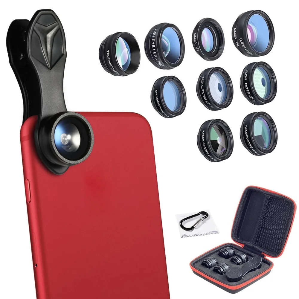Объектив рыбий глаз x 1 Широкоугольный и макрообъектив) x 1 2X объектив телескопа x 1 Звездный фильтр x 1 CPL x 1 Линза калейдоскопа 3x1 Линза калейдоскопа 6x1 Потока фильтр x 1 С радиальным фильтром x1 Объектив Кепки x 9 Универсальный зажим X 1 Пластиковый футляр (ЭВА)-1 шт. Салфетка для уборки х 1 Руководство пользователя-1 шт. Упаковка-1 шт.