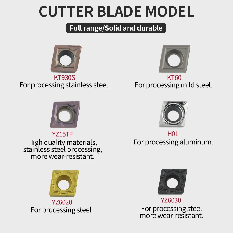 CCMT KT1505: используется для обработки стальных деталей.CCMT KT930S: используется для обработки нержавеющей стали.CCMT KT60: керамическое лезвие, используемое для обработки мягкой стали.CCMT H01: используется для обработки алюминиевых деталей.CCMT YZ6020: хорошая прочность, используется для обработки стальных деталей ниже 40 градусов.CCMT YZ5115: улучшенная версия, хорошая прочность, используется для обработки чугуна.CCMT YZ6030: высокая твердость, используется для обработки стальных деталей ниже 45 градусов.Наш бренд KEENCUTEER. Сейчас продукты находятся в период смены упаковки, и продукты с старой упаковкой могут быть отправлены. Не беспокойтесь о качестве, продукты одинаковые, спасибо за понимание.