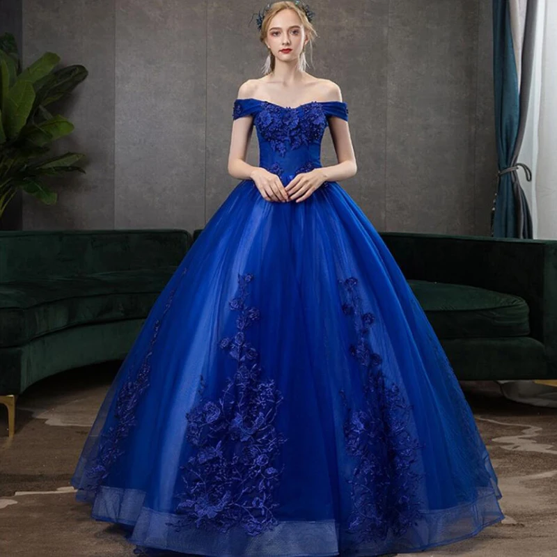 Женское винтажное платье с открытыми плечами, синее кружевное праздничное платье до пола, 15 лет