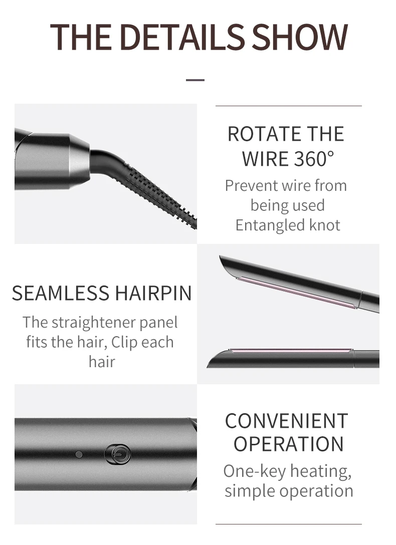 1. Термостатический нагреватель PTC2. Выпрямление и завивка двойного назначения3. Керамическая нагревательная трубка4. Работает влажной и сухой5. Простое управление6. Безопасный и безвредный7. Быстрое нагревание (за 20 секунд)8. Постоянная температура