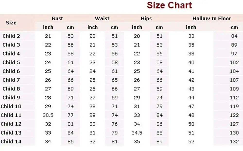 Пожалуйста, измерьте размер вашего ребенка в соответствии с таблицей размеров. Если вам не подходит размер, Пожалуйста, измерьте размер для меня. Я принимаю индивидуальный заказ. Спасибо! Это платье может быть сшито на заказ по вашим размерам. Если ваши параметры отсутствуют в таблице размеров, мы с радостью изготовим платье в соответствии с вашими мерками, как только вы согласитесь, что для лучшей подгонки необходимо выполнить окончательные изменения. Например: размер единицы измерения: сантиметры или дюймы. 1. бюст = _ дюймов 2. талия = _ дюймов 3. бедра = _ дюймов 4. от плеча до талии = _ дюймов 5. от талии до пола без обуви = _ дюймов 6. высота = _ (от верха до пола без обуви) 7. цвет платья = _ (любой цвет на выбор)