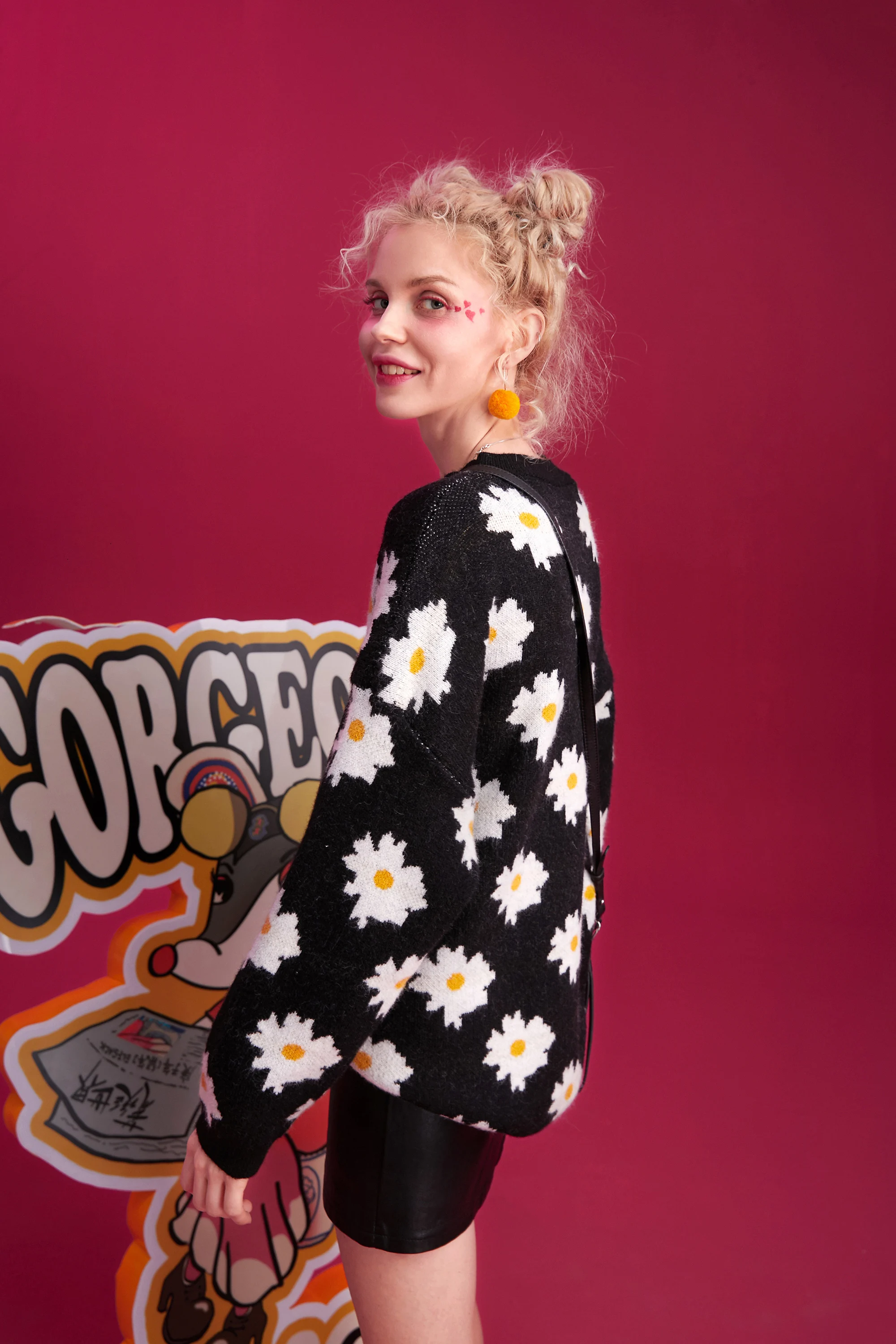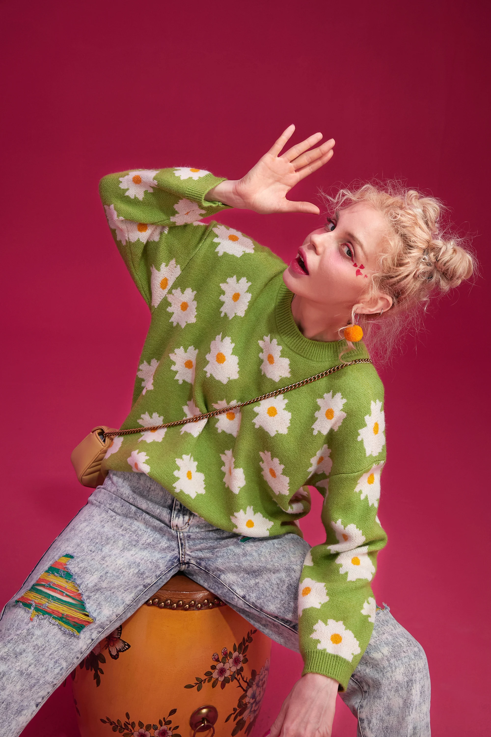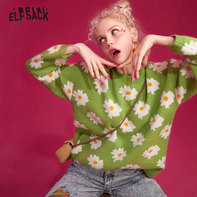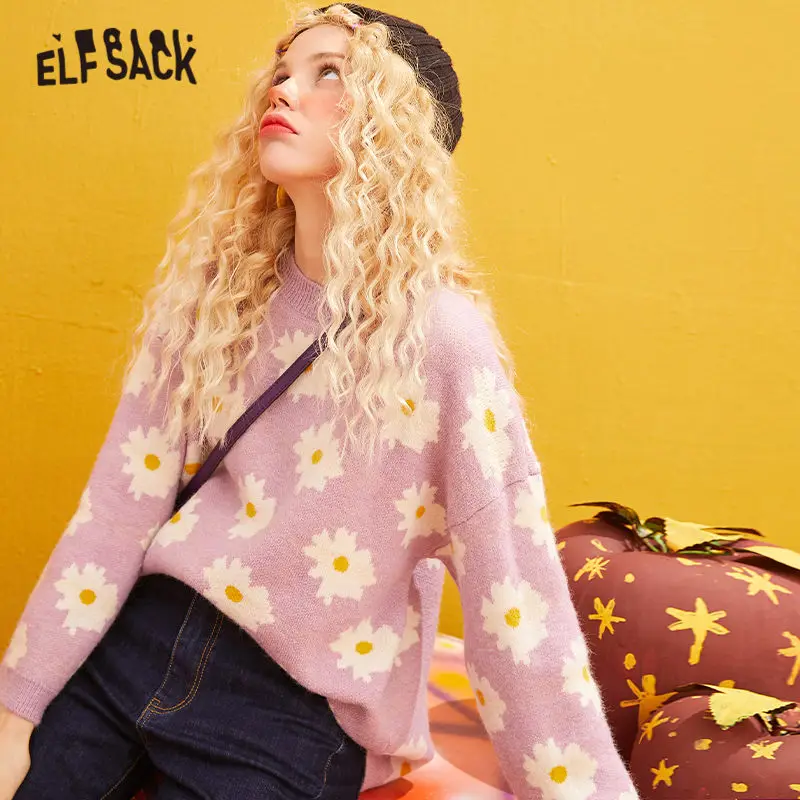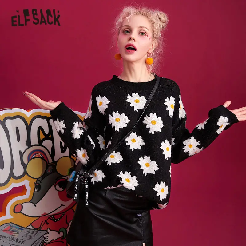 Женский разноцветный свитер ELFSACK, повседневный вязаный пуловер с цветочным принтом, офисные топы в Корейском стиле с длинным рукавом, зима 2019