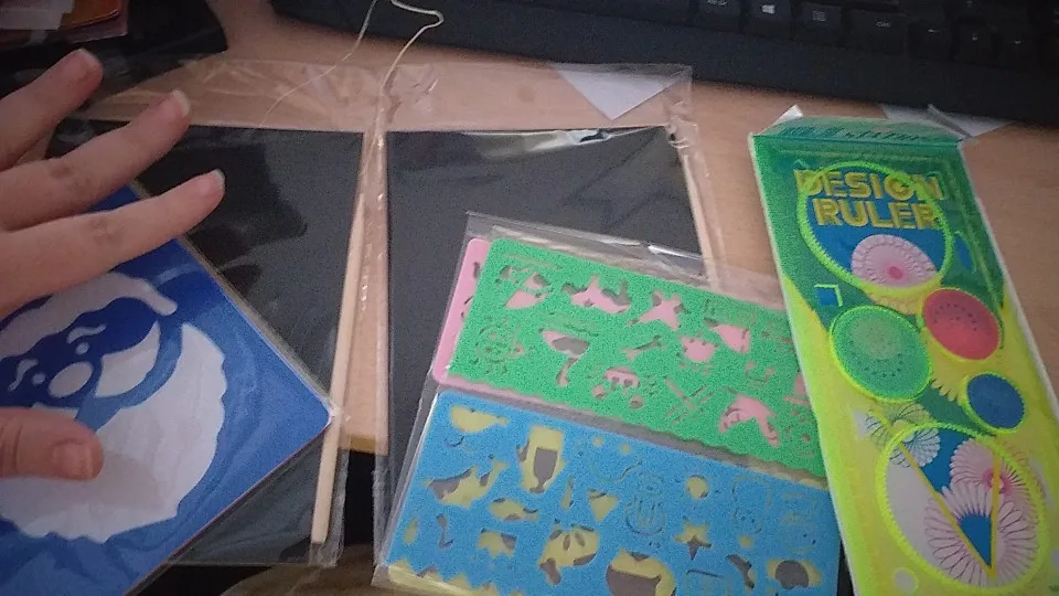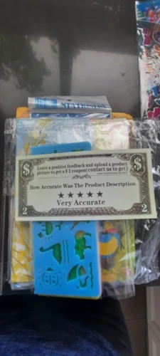 Описание комплекта является точным, и упаковка тоже была хорошей. Я оценил раскраску на тыльной стороне бумаги для царапин. Я еще не пробовал Спирограф, но выглядит так же хорошо, как и другие биты набора. Единственное, что мне не понравилось, это предоставленная палка, которая слишком плотная для трафаретов граффити.