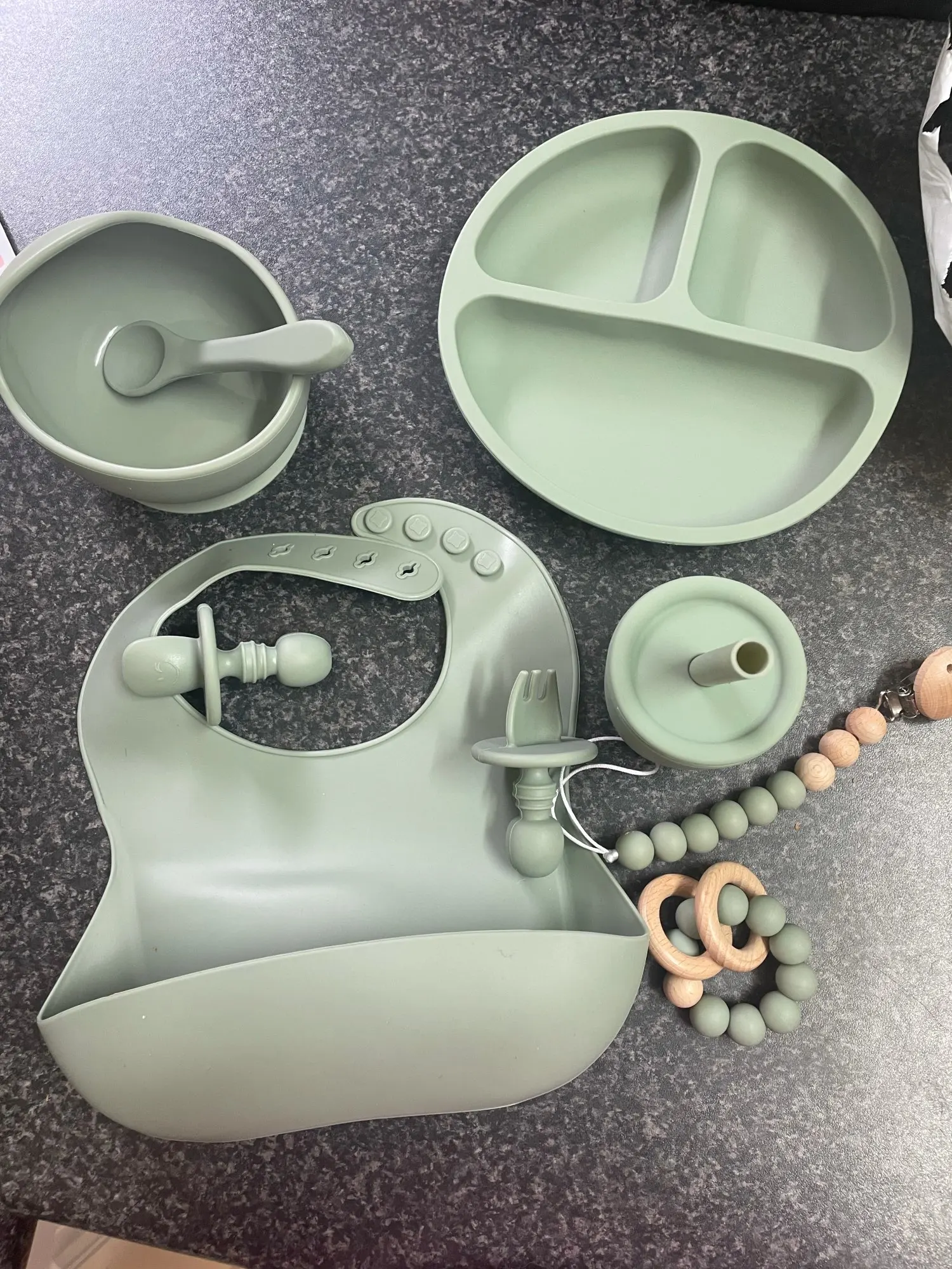 Нагрудник и силиконовая посуда супер. Продавца рекомендую как отзывчивого и лояльного!