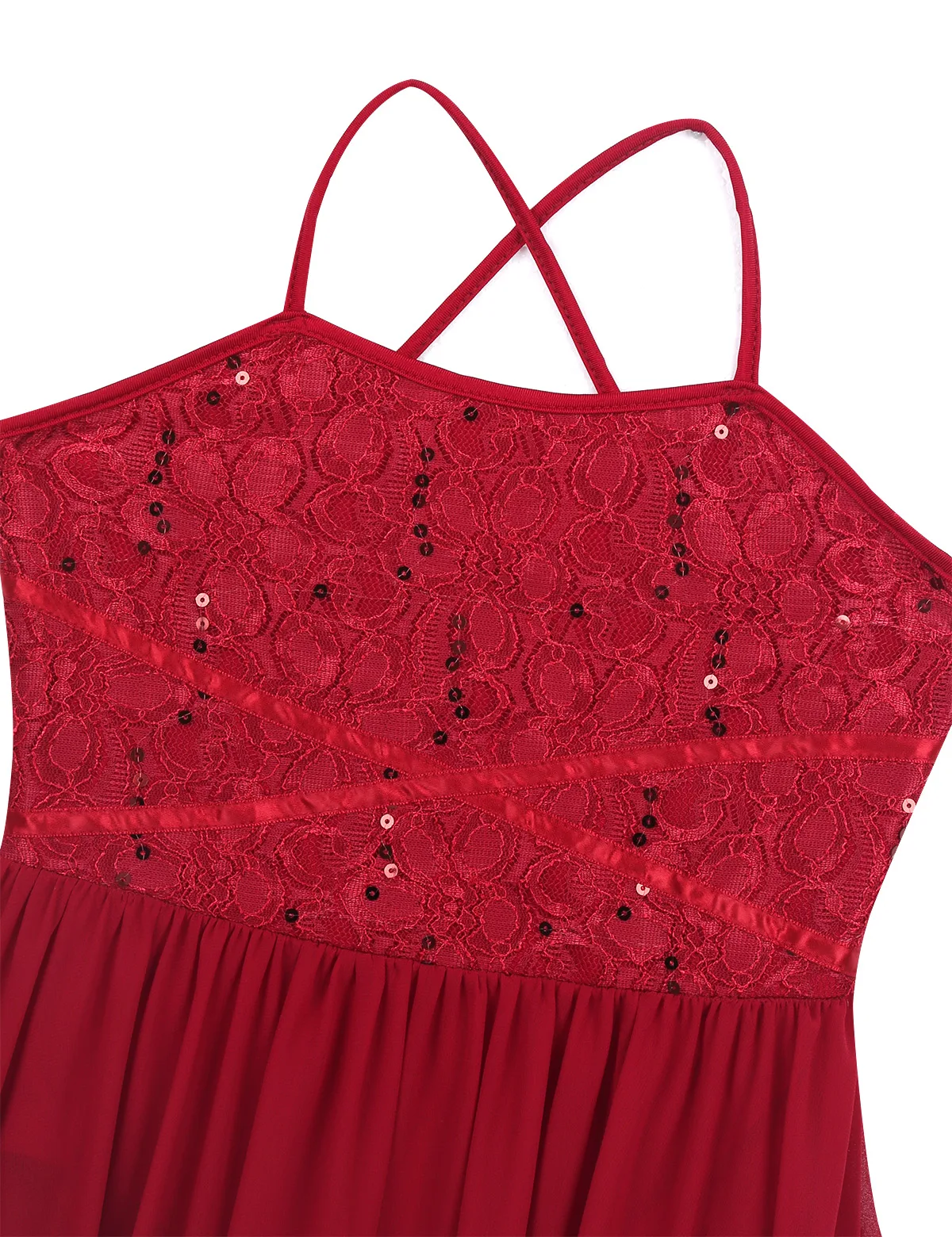 Трико платье изготовлено из полиэстера, кружева и шифона, ручная стирка. Таблица размеров означает возраст для девочек, но только для общего руководства. Бретельки на бретельках сзади, кружевной лиф с блестками, украшенный прошитыми лентами в форме х спереди. С подкладкой для удобного ношения. Скрытая боковая застежка-молния для удобного одевания. 1 многослойная шифоновая юбка с низким подолом, прилегающая к талии. Красивая и элегантная Одежда для танцев для вашей девочки. Идеально подходит для похвалы танцев, празднования духа, современного танца или катания на коньках и т. д.