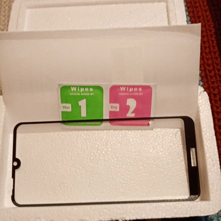 Посылка пришла за три недели, упаковка пенопластовая коробка. В комплекте защитное стекло и набор салфеток для протирки экрана. Стекло по качеству очень хорошее, клеится всей поверхностью, подливать масло не нужно. Отверстия совпадют, по краям зазор 0,5 мм. Рекомендую к покупке!