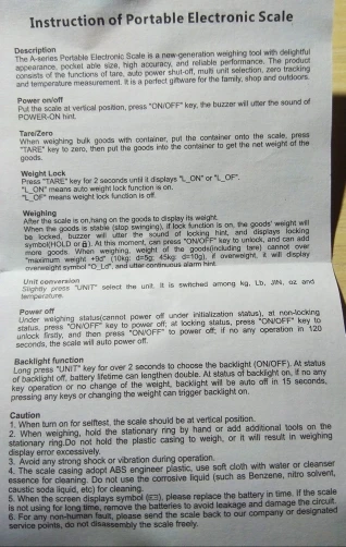 Инструкция к портативным электронным весам Описание Портативные электронные весы серии A - это весы нового поколения с восхитительным внешним видом, компактными размерами, высокой точностью и надежностью. Продукт включает в себя функции тарирования, автоматического отключения питания, выбора нескольких единиц измерения, отслеживания нуля и измерения температуры. Это идеальный подарок для семьи, магазина и отдыха на природе. Включение / выключение питания Установите весы в вертикальное положение, нажмите кнопку «ВКЛ / ВЫКЛ», зуммер издаст звук подсказки ВКЛЮЧЕНИЯ ПИТАНИЯ. Тара / Ноль При взвешивании сыпучих грузов в контейнере поместите контейнер на весы, нажмите клавишу «TARE» до нуля, затем поместите товар в контейнер, чтобы получить вес нетто. Блокировка веса Нажимайте кнопку «TARE» на 2 секунды, пока не отобразится «L_ON» или «L_OF». «L ON» означает, что функция автоматической фиксации веса включена. «L_OF» означает, что функция блокировки веса отключена. Взвешивание. После