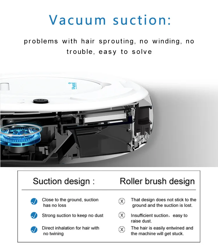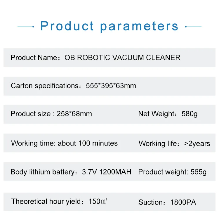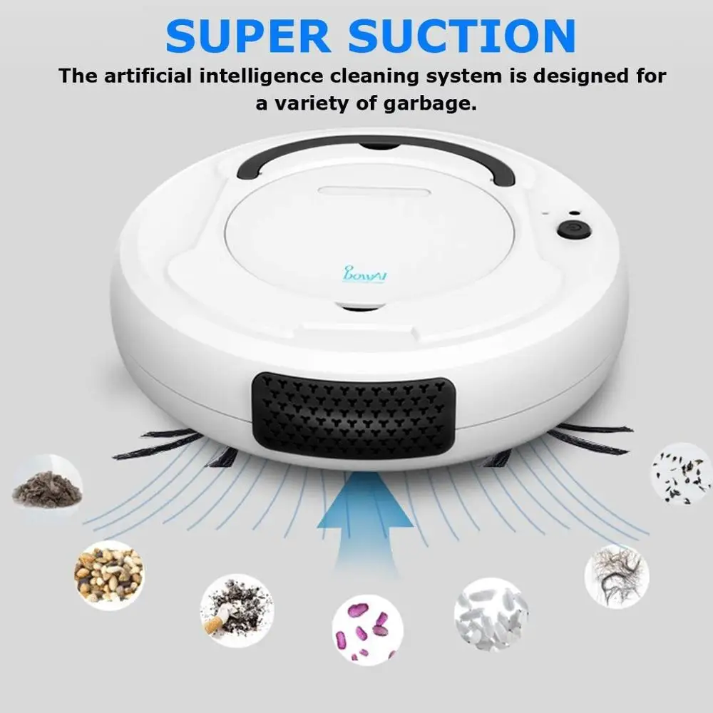 Особенности: -Сверхсильное всасывание. -Автоматически перемещать и чистить пол. -Автоматически изменит направление при встрече стен и препятствий. -Гибкий ход, с большим пылесборником для мусора. -Универсальное вождение, подметание пола (нет необходимости в поглощающей пыль бумаге). Характеристики: Материал: ABS + электронный компонент Цвет: черный/белый/серый (по желанию) Характеристики изделия: 26 × 26 × 6,5 ХАРАКТЕРИСТИКИ цветной коробки: 39 × 9 × 31 Упаковочная способность: 12 Литиевая батарея: 3,7 V 1200MAH Время работы: около 100 минут Время зарядки: около 150 минут Площадь очистки: 150 м2 Рабочее напряжение: 3,7 в Номинальная мощность: 3 Вт Пылесборник: около 400 мл Применимо к земле: плоский грунт, такой как мрамор, плитка, деревянный пол и т. д. Функция: Запуск одной кнопкой, подметание, Мытье полов, пылесос, USB зарядка, универсальное вождение, автоматическое избегание препятствий, защита от падения, низкий уровень шума, интимный эффект, низкое повторение, высокое покрытие Режим работы: 1. Режим переключения: нажмите на главный выключатель, и подметальная машина переходит в рабочий режим рабочей лампы светильник Нажмите хост-коммутатор еще раз и выключите уборочную машину. 2. Режим зарядки: Подключите Micro USB-головку USB-кабеля к зарядному порту уборочной машины и Подключите USB-головку к преобразователю для зарядки. 3. Состояние зарядки: индикатор зарядки горит, указывая, что зарядка заряжается, а Выкл означает, что зарядка завершена, а общее время зарядки составляет около 2-3 часов. Чистка пылесборника: (Грязь может выдуваться из входа, поэтому, пожалуйста, очистите пылесборник после каждого использования.) 1. Пылесборник расположен в нижней части машины, потяните заглушку, чтобы повернуть наружу. 2. Откройте пылесборник, очистите грязь внутри, вытрите остатки с помощью высушенной влажной ткани. 3. Поместите пылесборник обратно в машину. Предупреждение: 1. В целях безопасности этим продуктом должны управлять люди с физическим и умственным здоровьем и старше 14 лет. 2. Этот продукт не является водонепроницаемым, не позволяйте изделию контактировать с жидкостью и мелководью, вдали от источника огня. 3. Запрещается использовать в подвесной среде, такой как крыша, лестница, дуплексный дом и так далее. 4. Когда изделие на работе, пожалуйста, позаботьтесь о своей семье и домашних животных, чтобы предотвратить падение, штамповку и другие травмы. 5. В изделии используется универсальная конструкция, при столкновении перед препятствиями, возможность менять направление. 6. Прекратить зарядку, когда красный светильник гаснет, предотвратить перезаряд, повлиять на срок службы и аварию. 7. Если продукт появляется аномальным явлением, таким как запах, дым, аномальный шум, чрезмерная лихорадка. Пожалуйста, немедленно прекратите использование. Примечание. -Замеры сделаны вручную, поэтому возможны отклонения на 1-3 см. -Из-за различных дисплеев и разсветильник изображение может не отражать фактический цвет изделия. Спасибо за понимание.