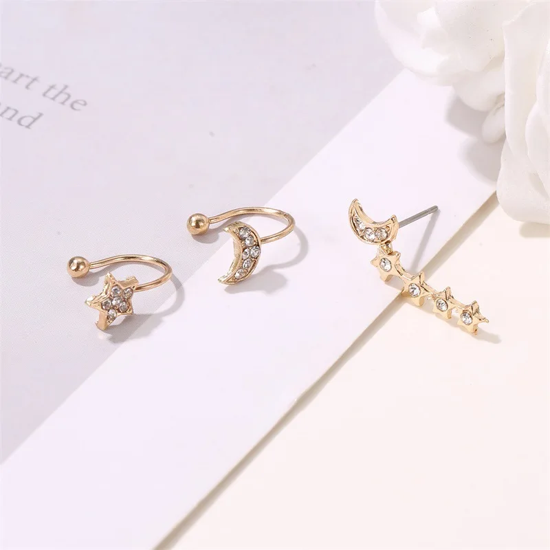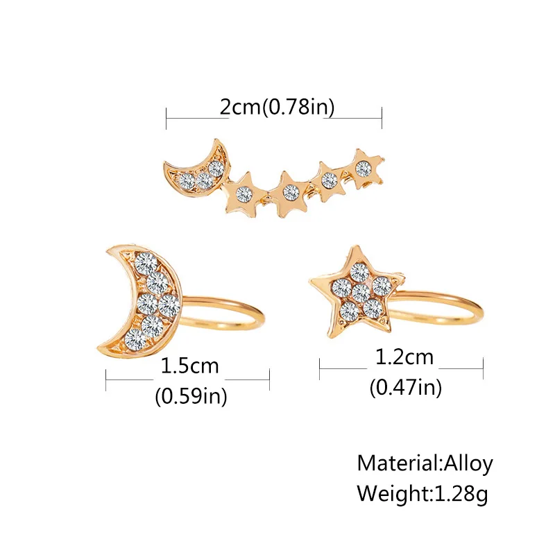 Клипсы с кристаллами, для женщин, в форме звезды, Луны, набор, серьги-каффы, серьги