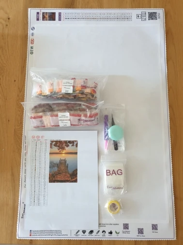 Упаковка: холст, алмазы, инструменты и клейкая этикетка.
