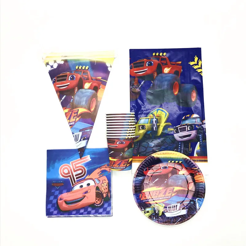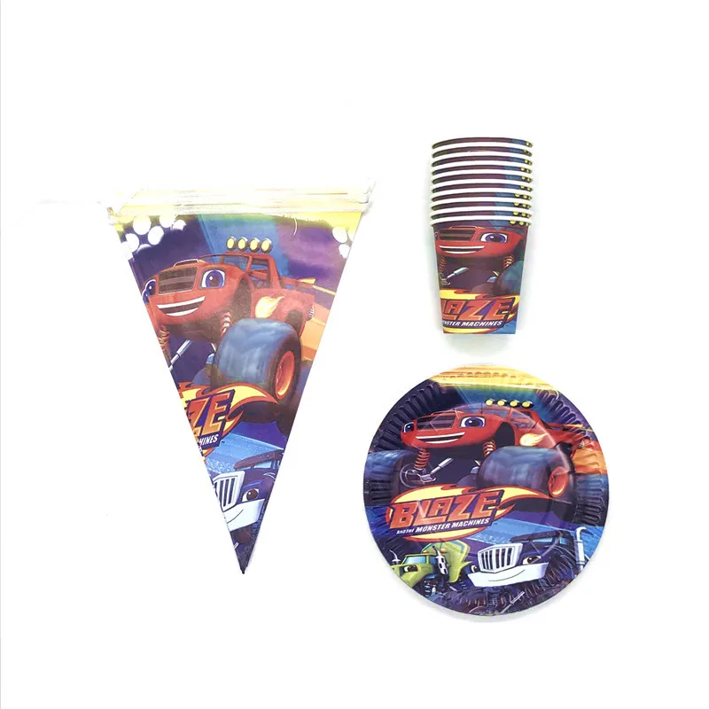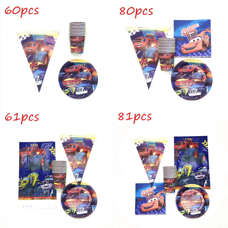 81 шт. машины Blaze And The Monster, украшения для дня рождения, детская посуда для будущей мамы, чашка, тарелка, флаг, скатерть
