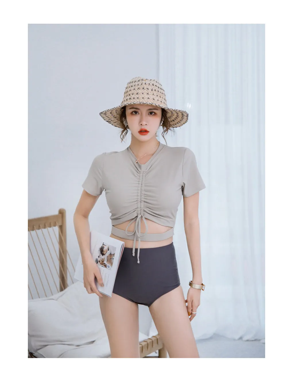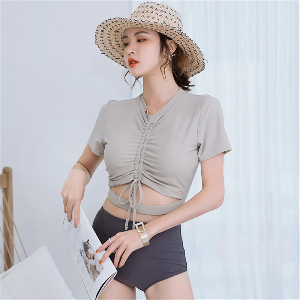 Женский купальник из двух частей с коротким рукавом, Одноцветный купальник, пуш-ап, танкини, корейский купальник с высокой талией, плиссированное бикини, с вырезами, для пляжа