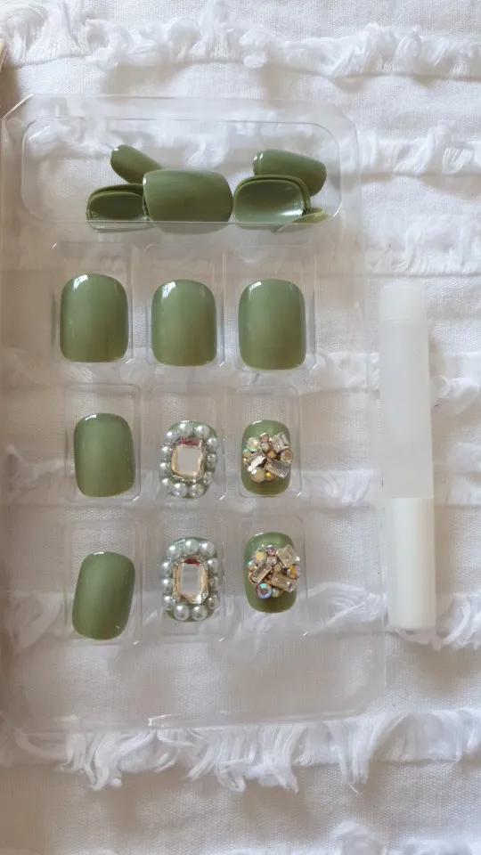 Накладные ногти для женщин, 24 шт., с полным покрытием, в японском стиле, зеленого цвета, с блестящими Стразы