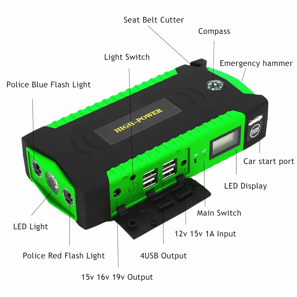 Высокомощный стартер скачка автомобиля-стартер скачка автомобиля, для запуска 12V бензиновый автомобиль (до 5.0L) и дизельный автомобиль (до 3.0L) как раз в считанные секунды, когда батарея автомобиля мертва; портативные 4USB портативные электронные устройства для зарядки, такие как мобильные телефоны, планшеты, портативная игровая система, цифровые камеры, Видеокамеры, bluetooth-гарнитуры, портативные gps-устройства и любые другие электронные устройства с питанием от постоянного тока 5 В; Мощное зарядное устройство для ноутбуков-8 адаптеров для разных типов зарядных устройств; предупреждение ющий светильник-Предупреждение ющий светильник был сделан красным и синим цветом светильник s. И strobes различных цветов светильник s делает его легче для других, чтобы заметить; Многофункциональный аварийный светильник s - Flash светильник/Стробоскоп светильник/SOS светильник. Если вы находитесь на открытом воздухе в кемпинге и окажетесь в чрезвычайной ситуации, вы можете использовать сигнальный светильник SOS для привлечения внимания. И вы можете использовать его как фонарь со встроенной функцией светодиодный фонарь светильник; Мини компас и молоток безопасности и ремень безопасности резак-вы никогда не потеряете, где бы вы ни ездили. Лучший помощник при аварийной ситуации; Водонепроницаемость и защита от температуры-запуск легко, даже в-20 ~ 60 °C; Лучшие подарки для вашего отца, братьев, мужа, друзей и себя; лучший партнер для ваших автомобилей.